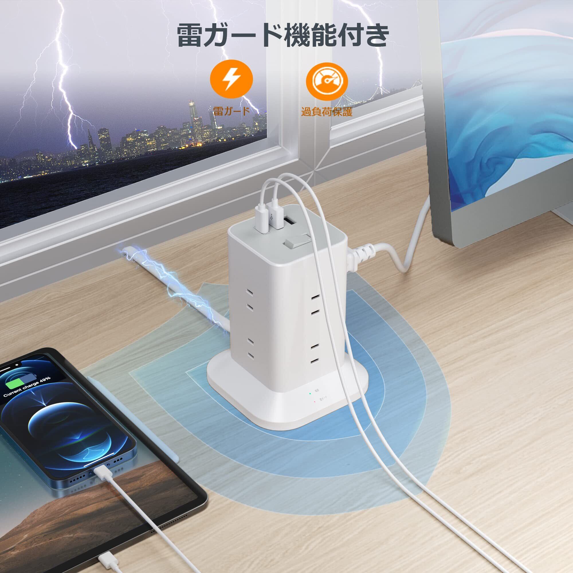 電源タップ タワー 延長コード 3m usb たこあしコンセント テーブルタップ TESSAN 8個AC口 1タイプCポートと2タイプAポート タコ足配線 スイングプラグ 雷ガード oa マルチ