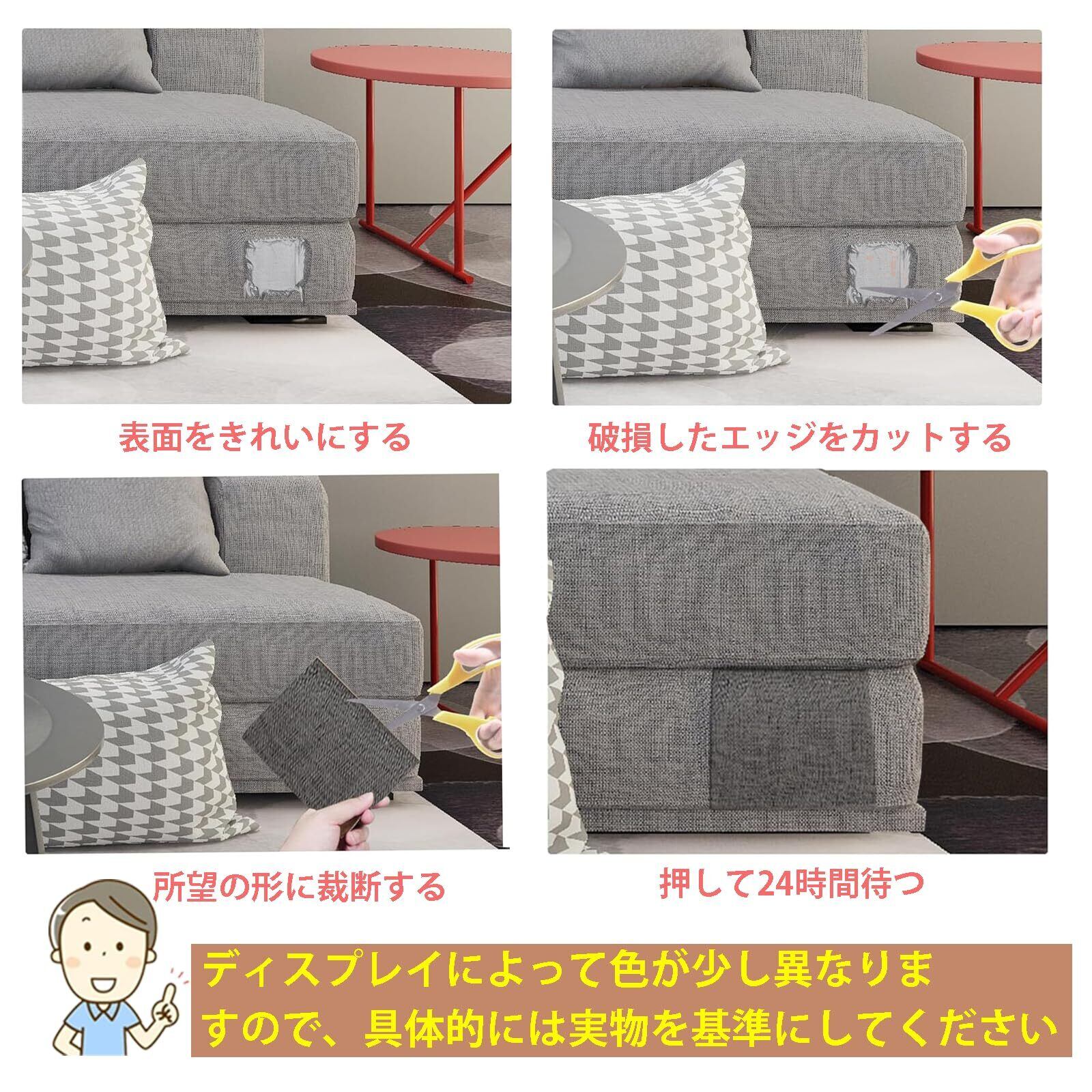 【製品仕様】:補修シート布 長さ28 cm×幅20 cm 2枚で、引き裂き、ペットの傷、穴、色あせ、やけど、その他の織物の修復など、さまざまな織物の損傷を修復できます。※お使いのデバイスによっては、実物と若干色合いが異なる画像が表示される場合がございます。