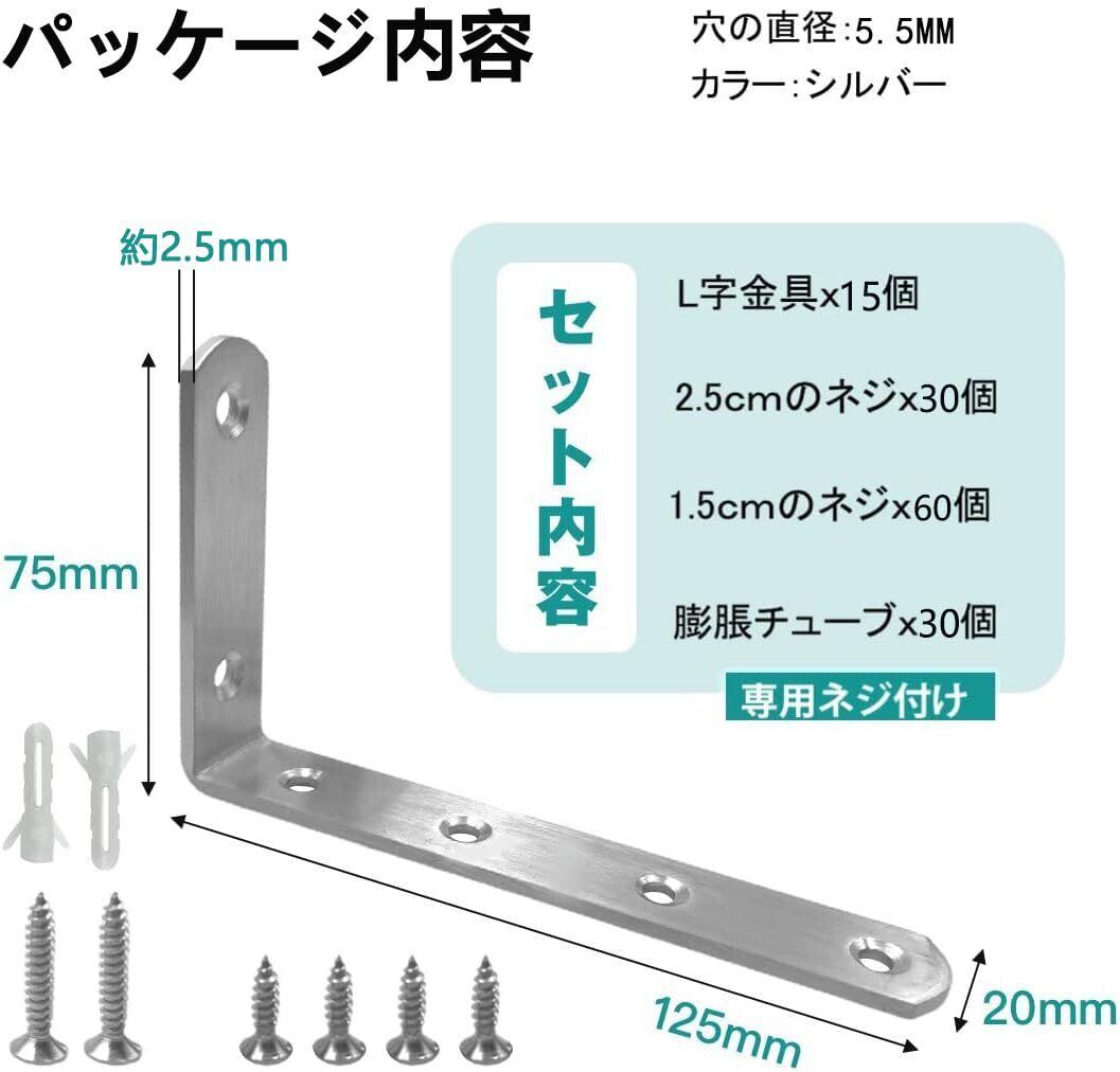 【新春セール】ドウシュウ(同舟) l字金具 15個 棚受け l型金具 補強金具 固定金具 地震対策 耐震 転倒防止 アングルブラケット l字ステー ステンレス製 125*75*20mm コーナーブレース 接合金具 90個ネジ付け