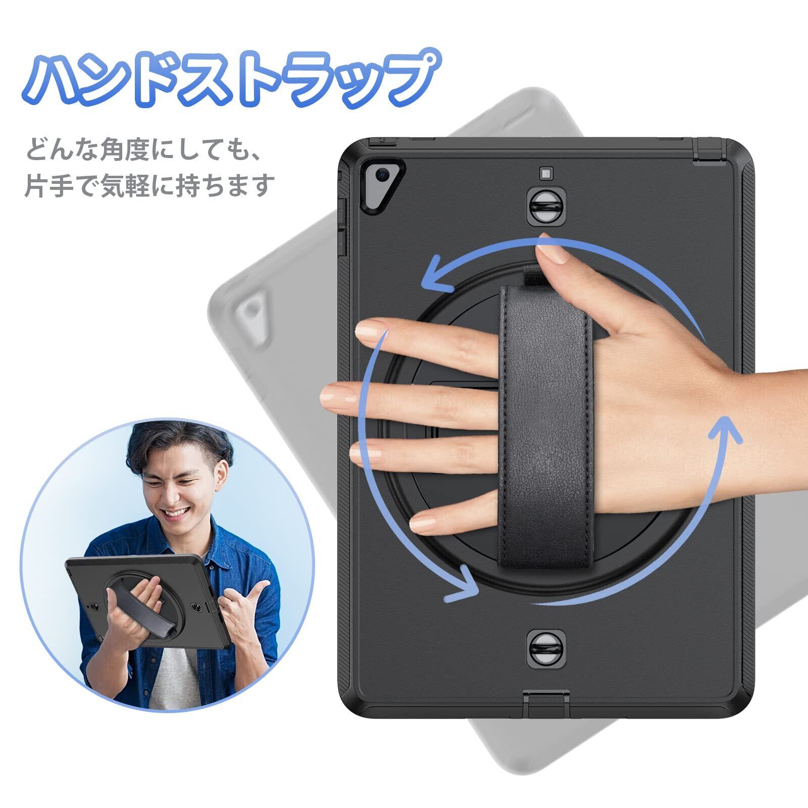 Timecity iPad 第5/6世代 (9.7インチ) ケース iPad Air2 ケース 耐衝撃 スリム 三層保護 ハンドストラップ 肩紐 ペンホルダー 360度回転 スタンド付き 保護フィルム 防塵デザイン 使い勝手 子ども 屋内/アウトドア (ブラック)(適格請求書発行可能)