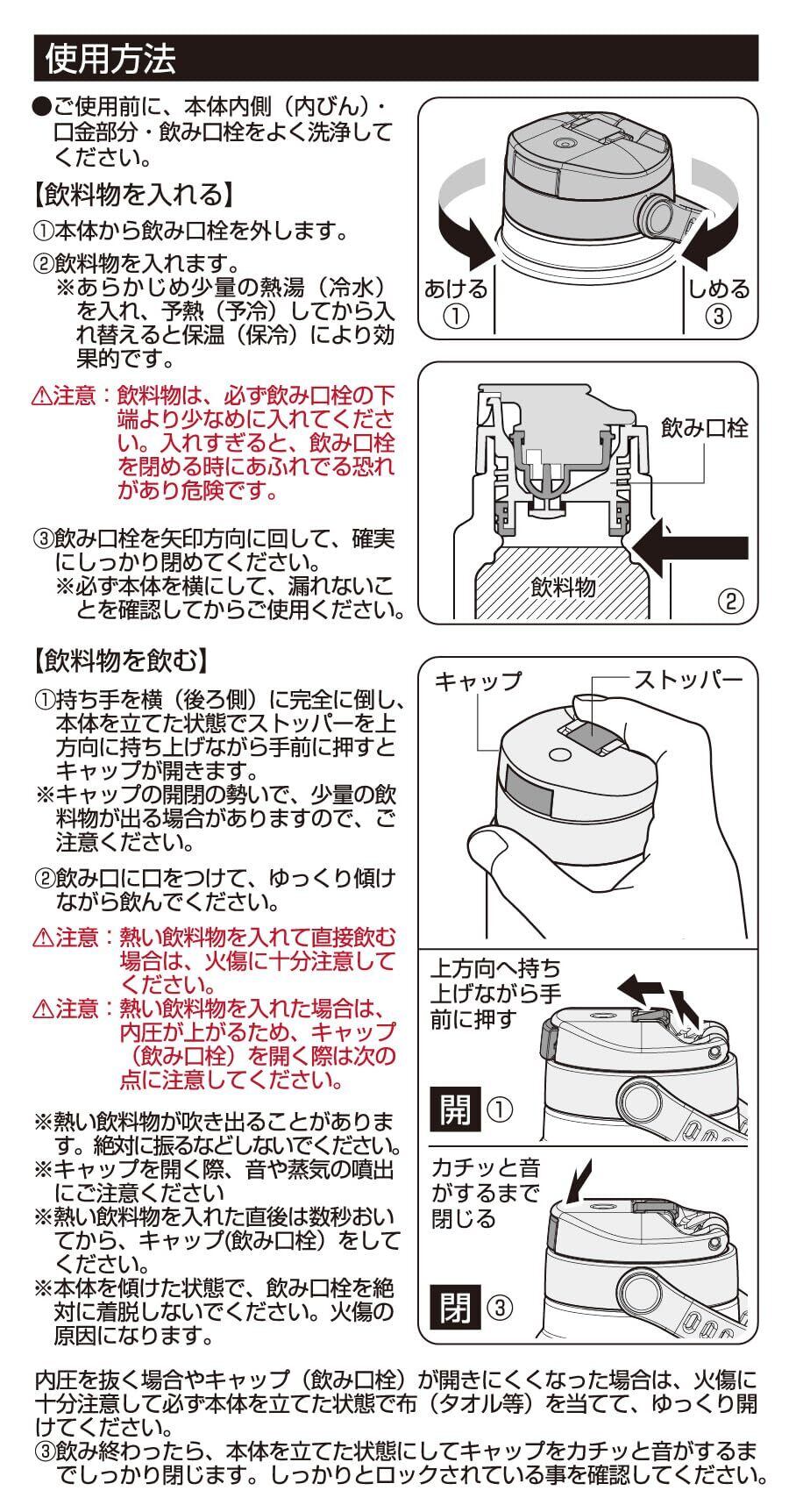 特徴:真空二重構造で保温、保冷で使用可能。冷水・お湯を入れることができるため、オールシーズン使用可能。【ワンタッチオープン】ストッパーを上げながら手前に押すことでフタが開く。飲み口栓は誤作動でフタが開きにくいストッパー構造。飲み口栓は分解洗浄可能。洗浄の際に飲み口とパッキンに分解可能。家庭用製氷機の氷が入る広口タイプ。持ち運びに便利なハンドル付き。