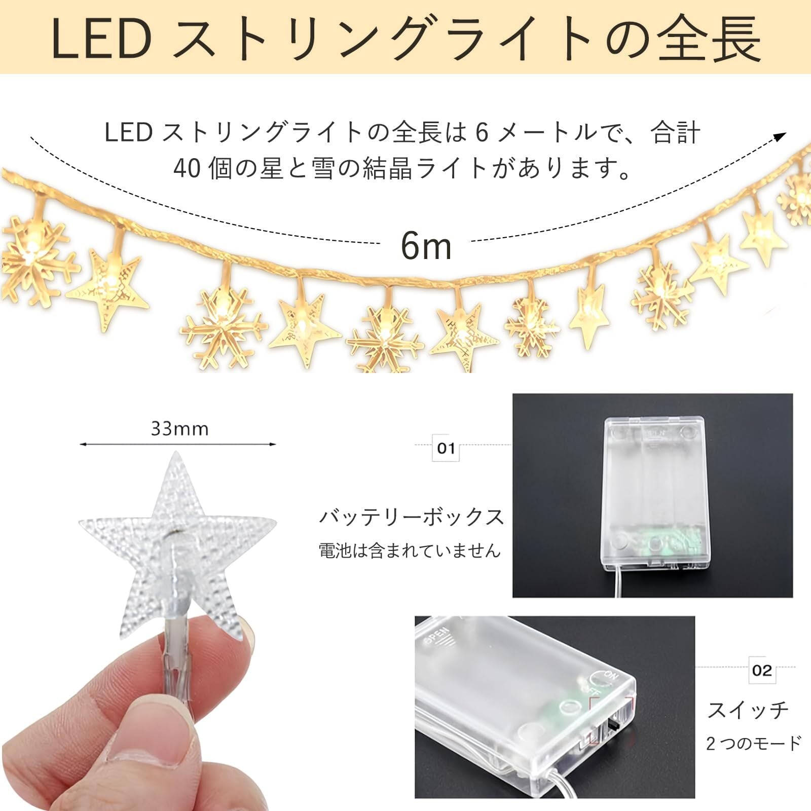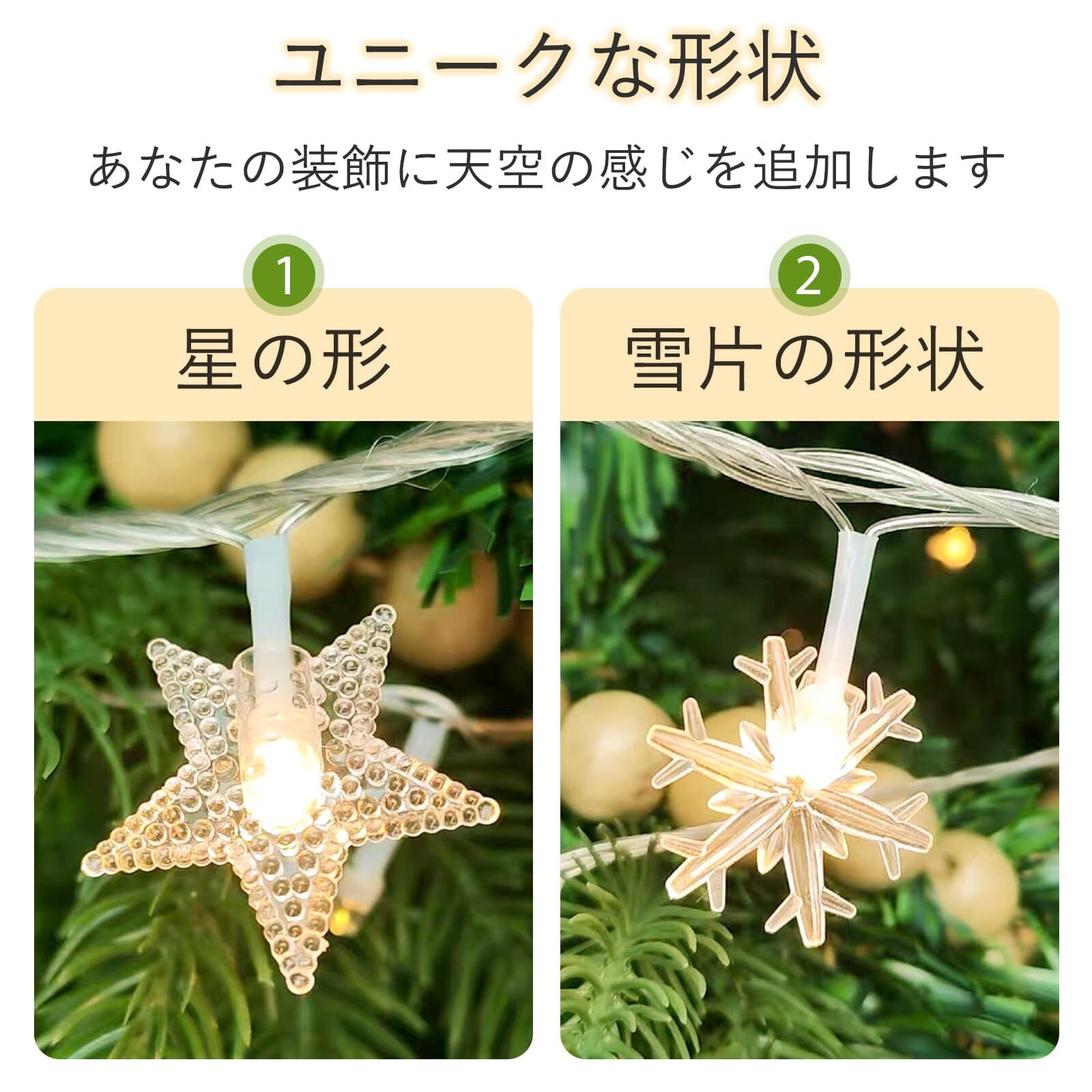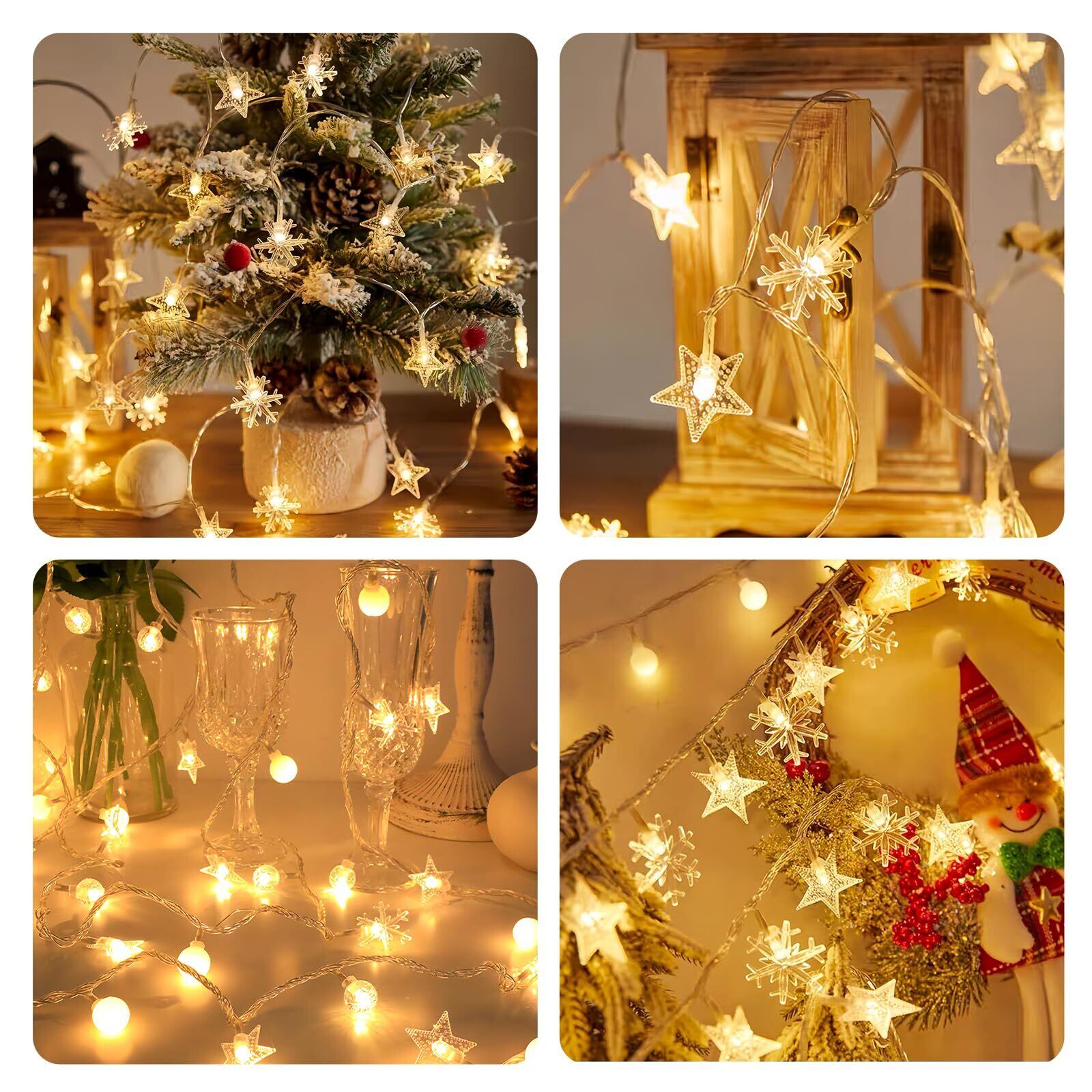 【2つの点灯モード】:LEDストリングは常時点灯と点滅モードがあります。 あなたの異なる照明ニーズに適しています。 点灯と消灯のモードを切り替えるだけで、あらゆる場面でとても便利です。 装飾的なライトストリングは美しくデザインされた星と雪の結晶の形で構成され、ロマンチックな雰囲気を作り出すのに役立ちます。