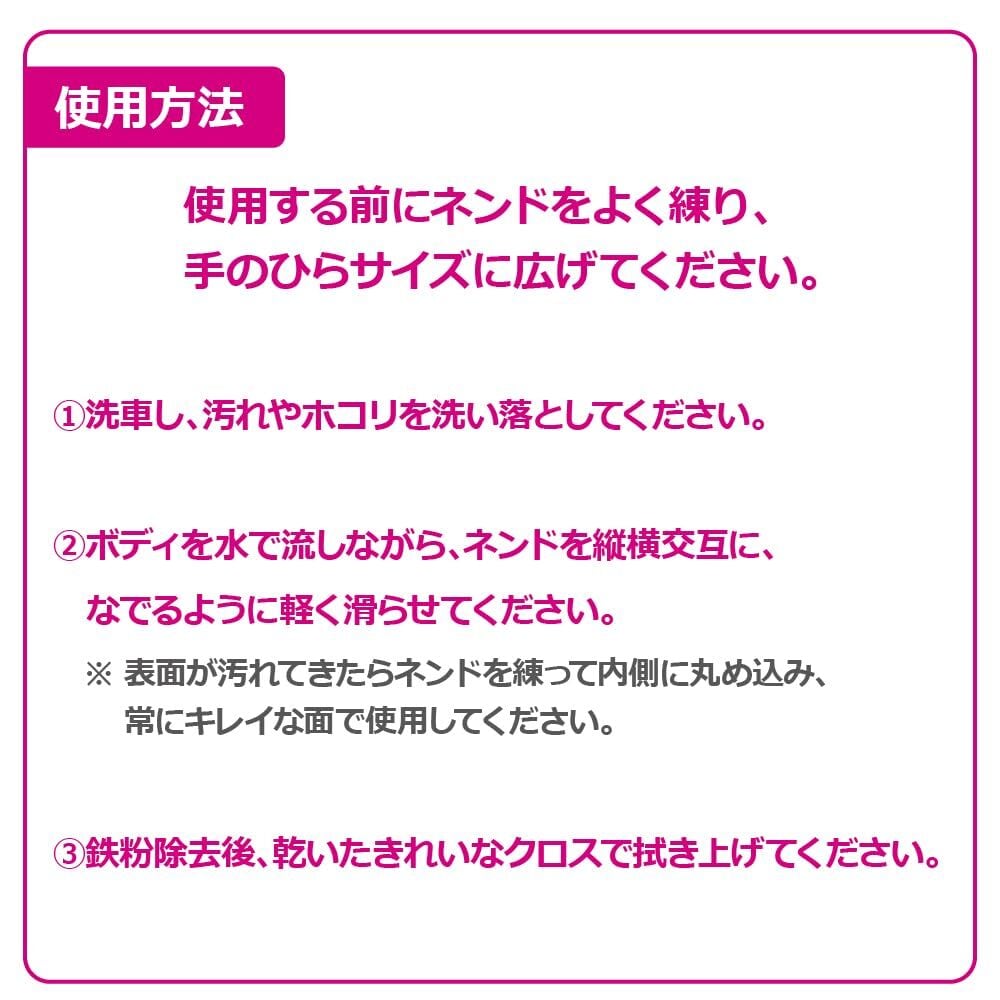 洗車では取り切れない鉄粉・ザラつきを吸着除去。柔らかくよくのびて、練りやすい。初心者でも使いやすく、すべりがいいので簡単に作業できる。やわらかいので、様々な面にもしっかり吸い付く。ノーコンパウンドでボディに優しい。コーティング施行車・全塗装色使用可能。