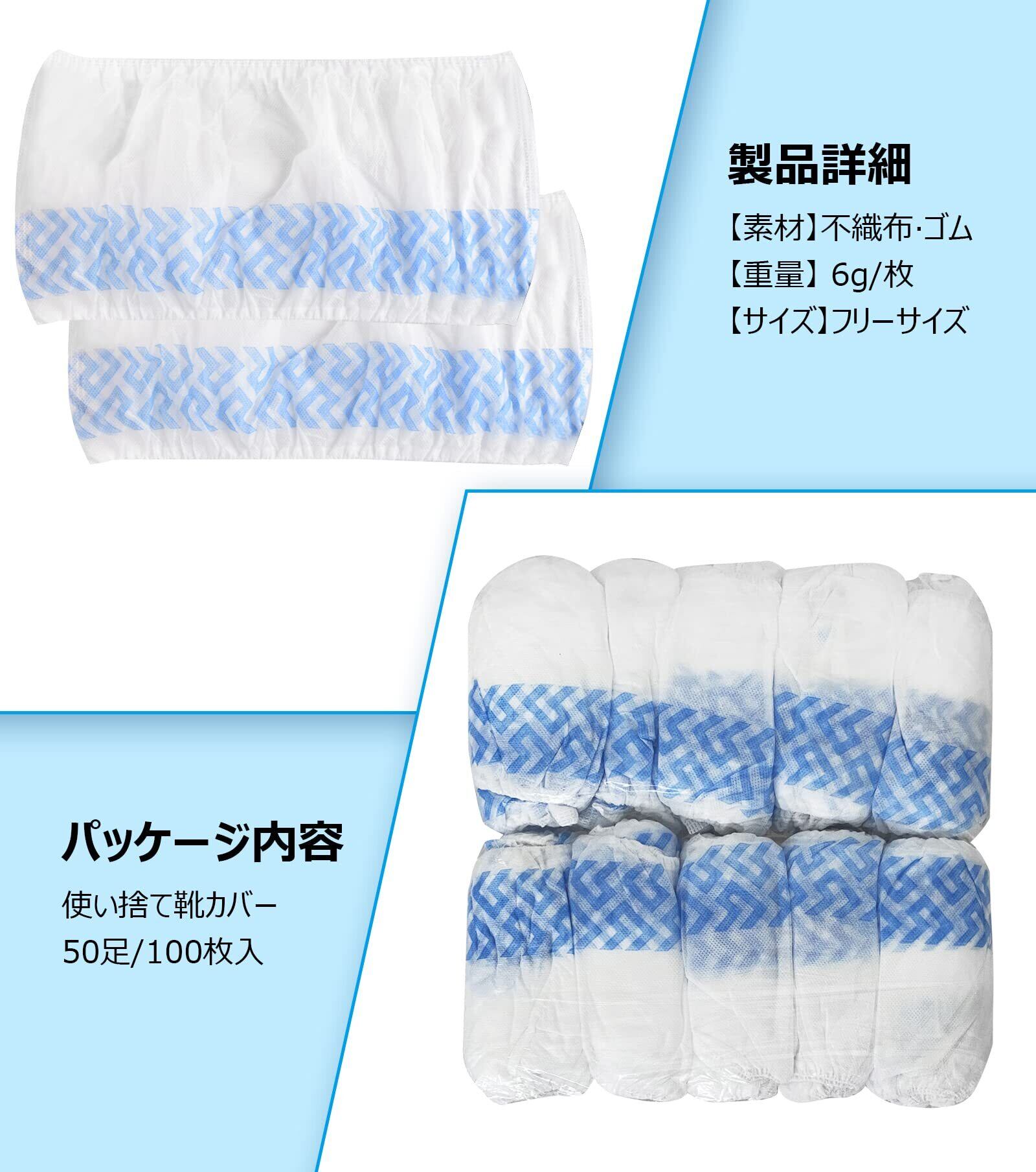 【商品仕様】セット内容:不織布靴カバー100枚(50足)。カラー:ホワイト。サイズ:フリーサイズ。伸長時・長×高:約40×15cm。重量(約):1枚6g。