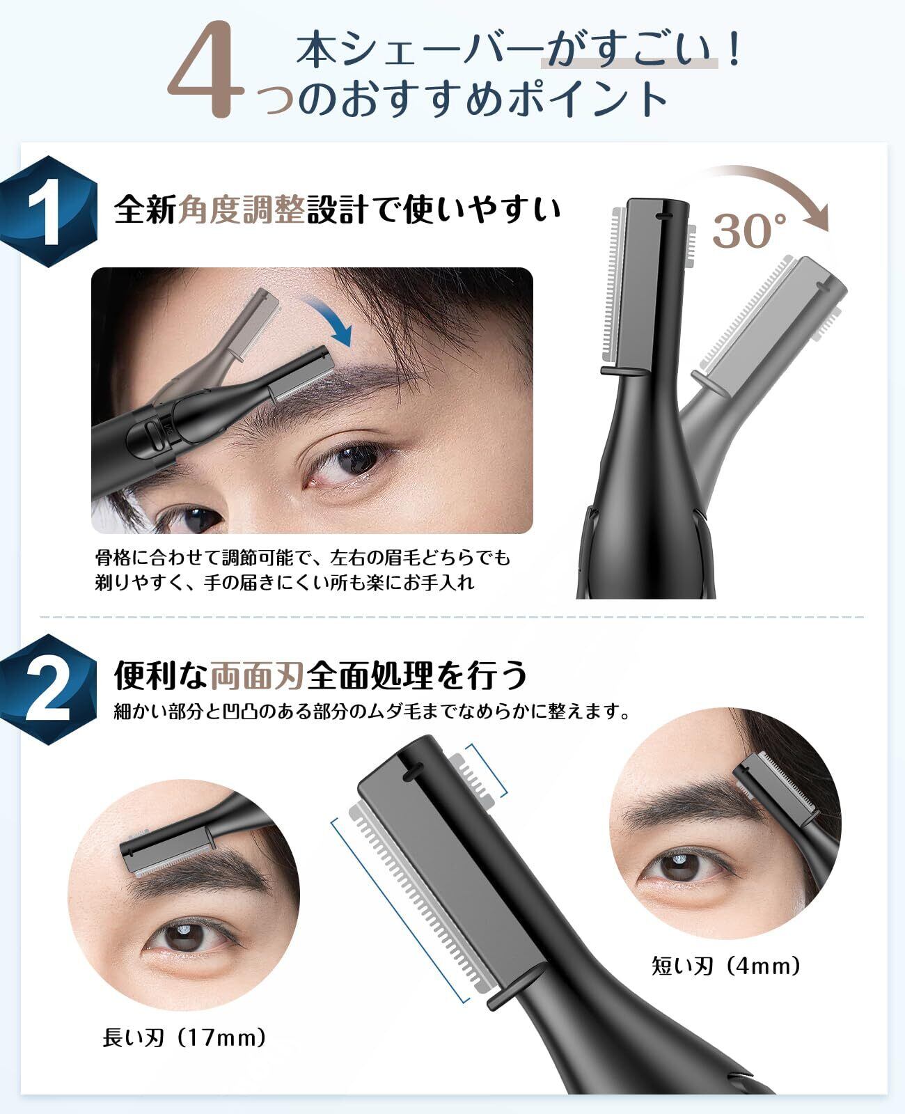 【30°回転可能&両面プレード革新電動式眉毛シェーバー】お客様が眉毛を整える体験をさらによくするため、眉毛シェーバーのヘッド部が最新技術の30°回転する設計を採用し、左右のまゆげどちらでも剃りやすく、より便利なムダ毛処理を実現できます。大きさの異なる両面プレードは0.12mmも薄く、肌に密着し、広い部分でも細かい部分でもきれいに剃ることができます。シンプルや汎用性も従来品より抜群!