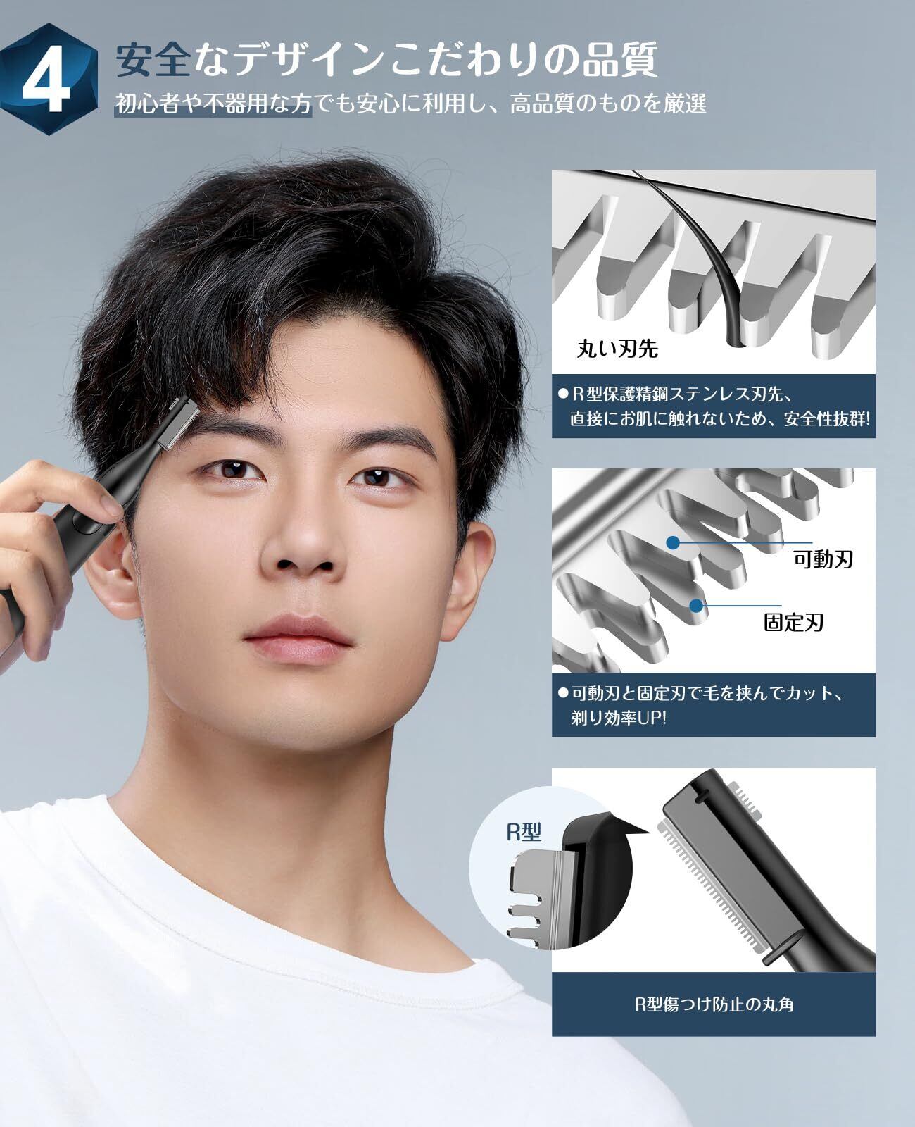 【R型安全デザイン&高速モーター搭載&低騒音眉カッター】うぶ毛シェーバーは最新のR型鈍角設計で、固定刃と可動刃の2枚刃で毛を挟んで切る仕組みです。直接にお肌に触れないため、傷と赤みを防ぎ、刺激を与えず、お肌に優しくかつ安全な製品となっております。また、強力モーターを内蔵しているので、引っ張ることなく、効率的にもみあげなどにある太めの毛をカットして整えるのにも適しています。静音ノイズ低減システムを採用し、40bd以内の動作音が快適で静かで、他人に影響を与えずにいつでも簡単に使用できます。