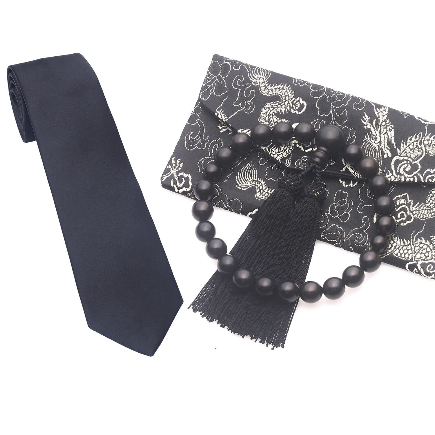 数珠、黒いネクタイと高級な念珠袋を組み合わせたとてもお買い得なセットです。