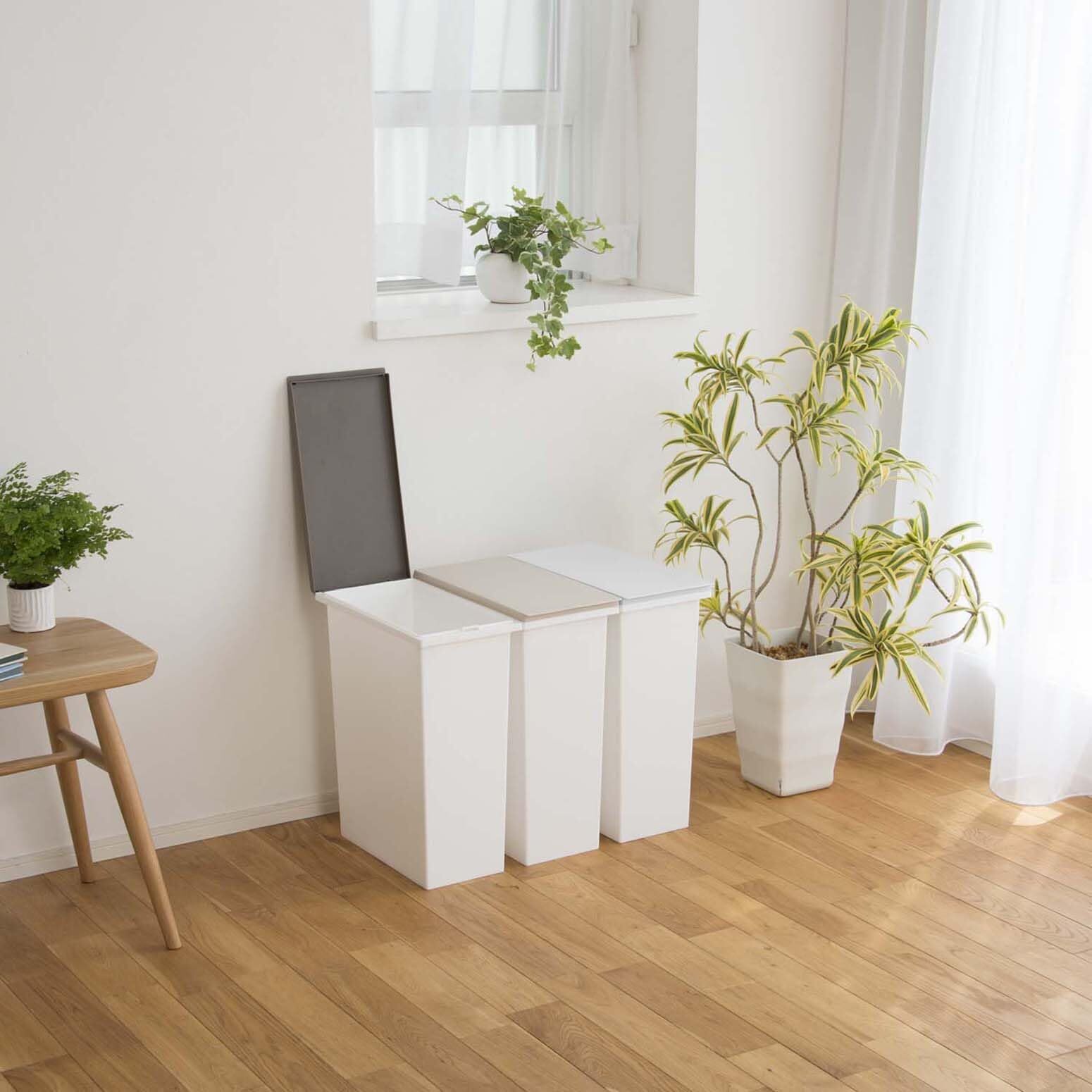 サイズ(1個あたり):幅18.5×奥行36.5×高さ43.5cm、容量(1個あたり):20L、素材・材質:ポリプロピレン、セット内容・付属品:本体3個+フタ3枚(ブラウン/ベージュ/ホワイトグレー)、生産国:日本