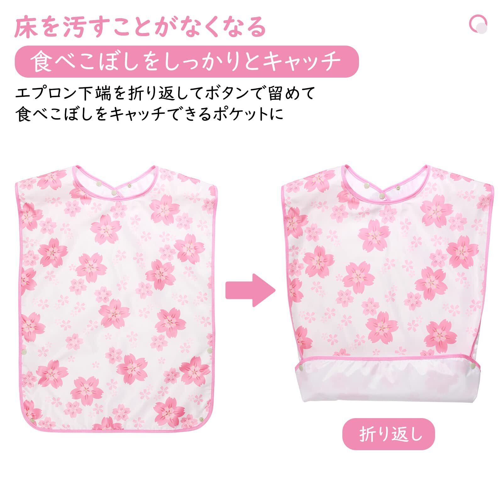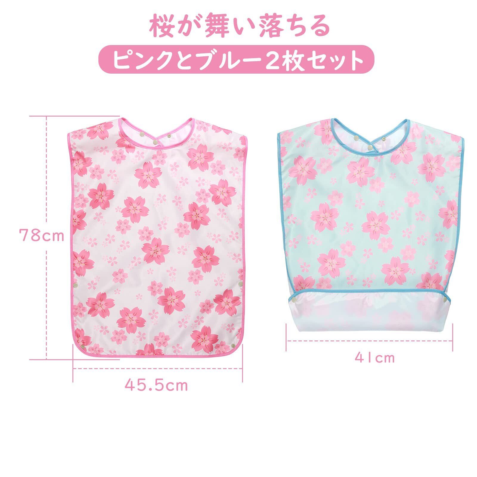 「上質な素材採用」 2枚の介護用エプロンは上質なポリエステル素材採用しており、防水コーティング施され、汁物が多くても強い吸水力を備えており、衣服に染み込み汚す心配はありません。キレイな桜の花が舞い落ちる柄に設計し、女性の方へのプレゼントに最適です。
