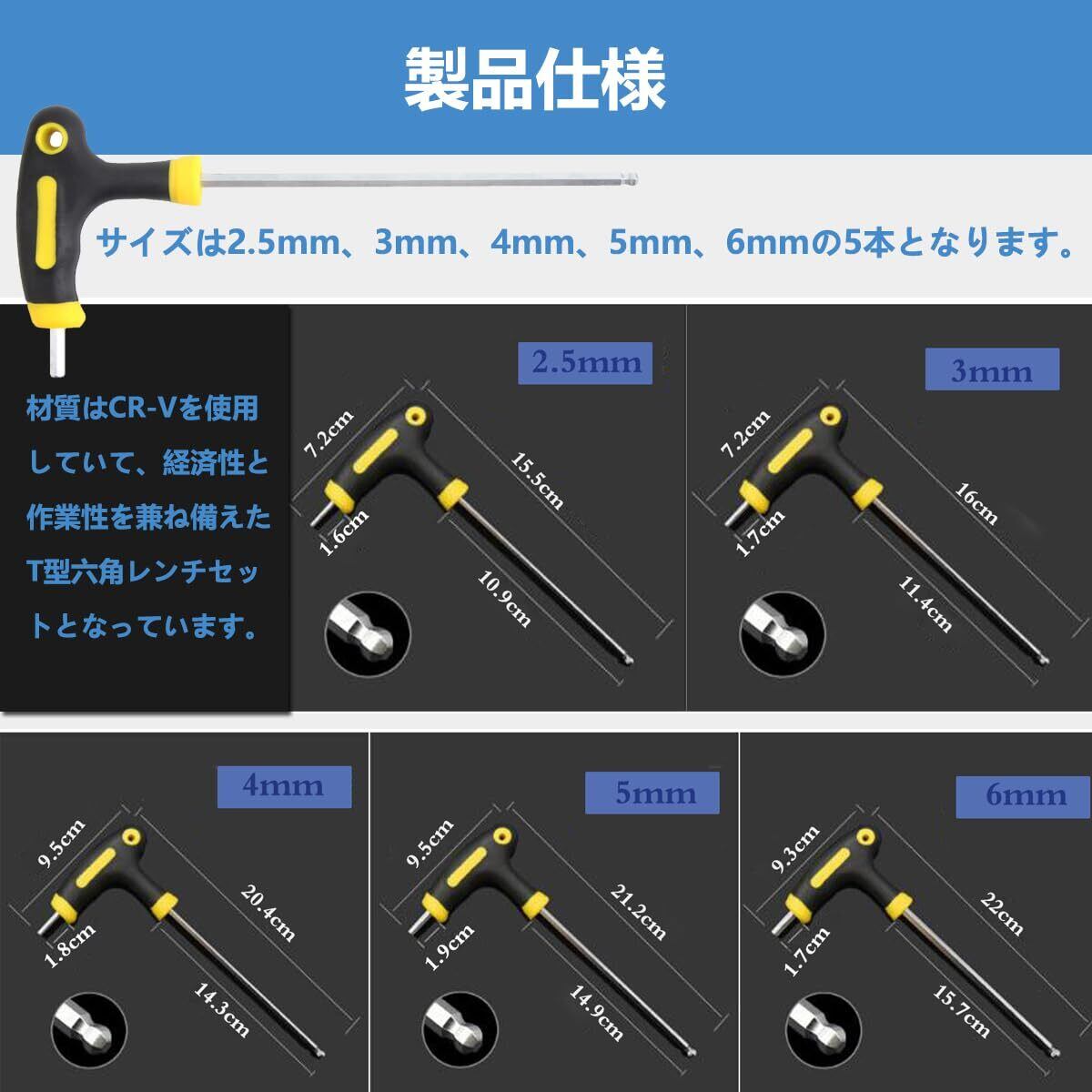 T型ロングボールポイント六角棒レンチ 2.5mm 3mm 4mm 5mm 6mm ロングクロムバナジウム鋼 六角レンチ5本セット 穴方向に関係なく、斜めからでも強力締付け可能 自転車・バイク・車・ 機械修理に適用