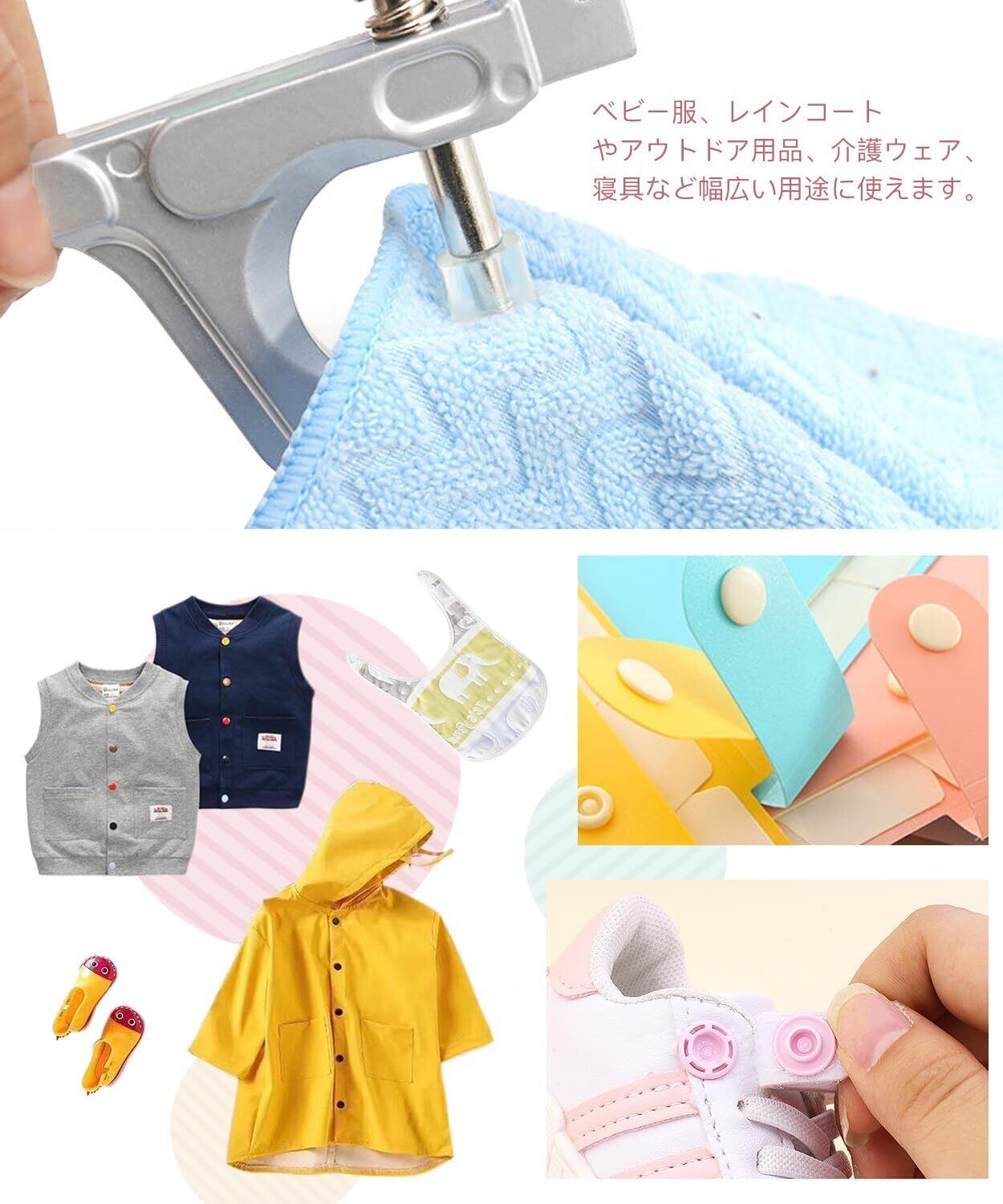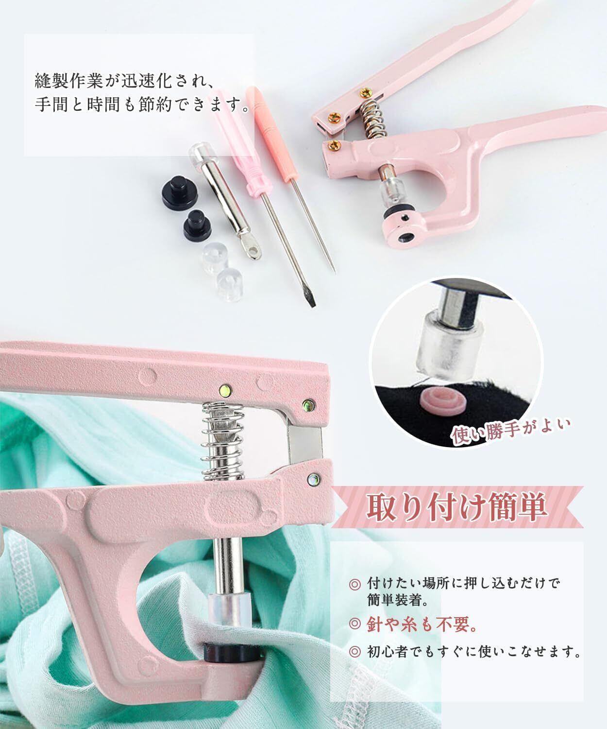 便利:付けたい位置にスナップをセットして専用ハンディプレスでカシめるだけです。