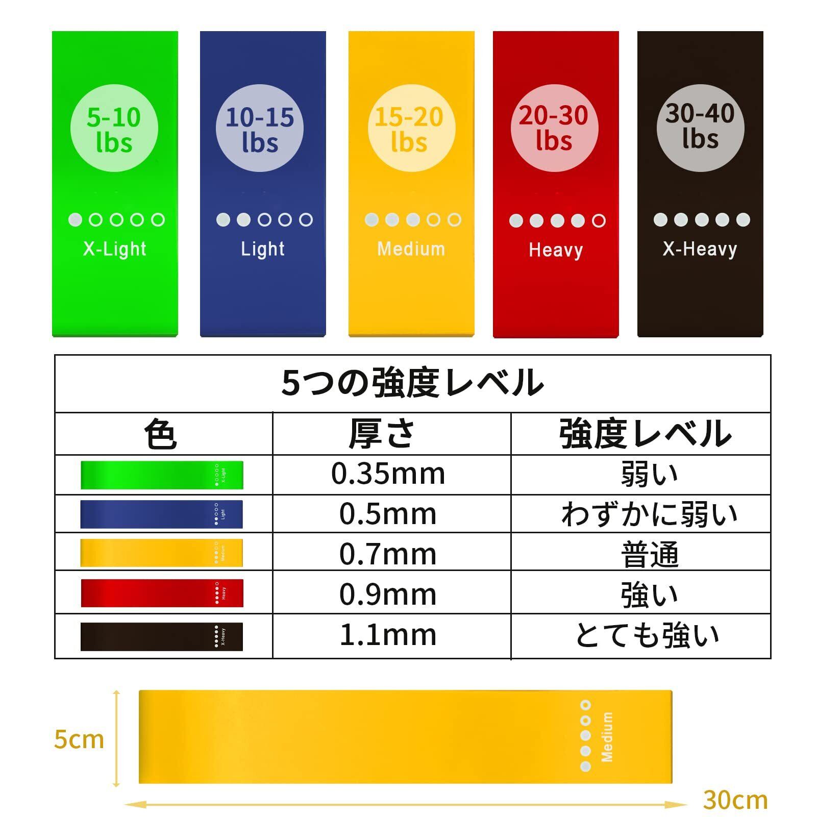 【初心者でも始めやすい5つの負荷強度トレーニングチューブ 】 強度は色によって異なり、それぞれX-Light(最弱)-Light(弱)-Medium(普通)-Heavy(強)-X-Heavy(最強)となっています。負荷は5種類から選べるので自分に合った強度でトレーニングできます。