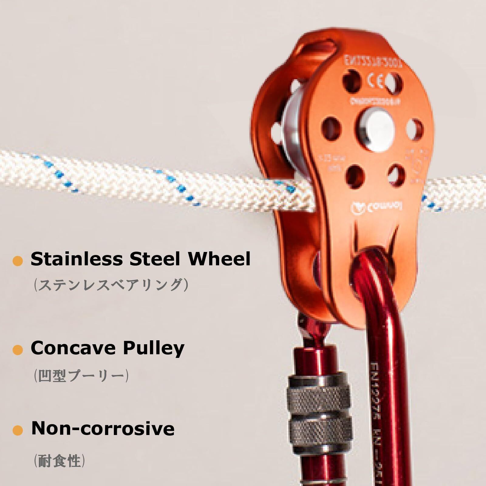 【強度】- マイクロプーリ破断強度: 26kN、最大ロープ直径: 12mm。人や物を引き上げる時に省力化にします