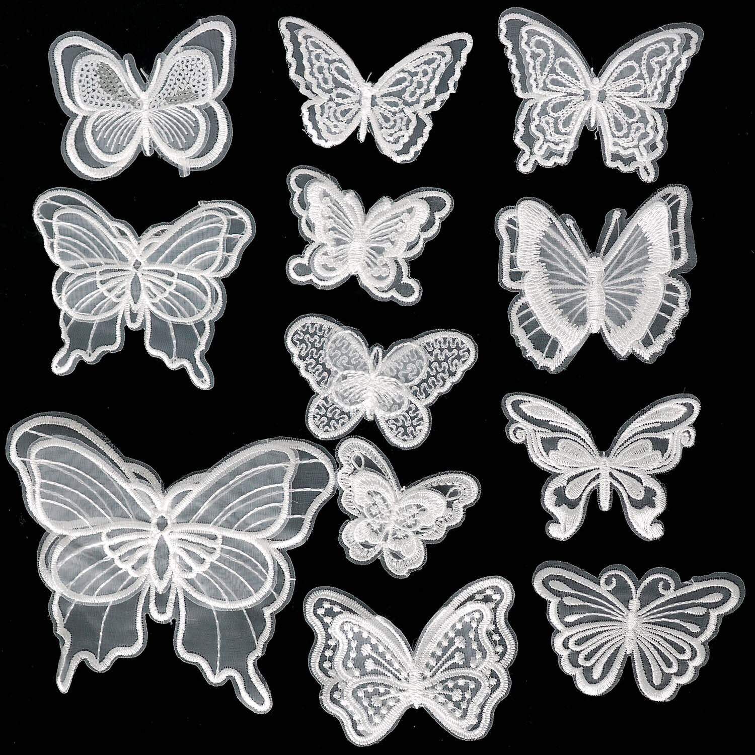 sempiterno 12個セットレース生地 刺繍花 花と蝶のパターン 縫製 DIY 服 工芸品の装飾 パッチ アップリケ モチーフ バッグ 靴 帽子 飾り アクセサリー(ホワイト12個セット/蝶)