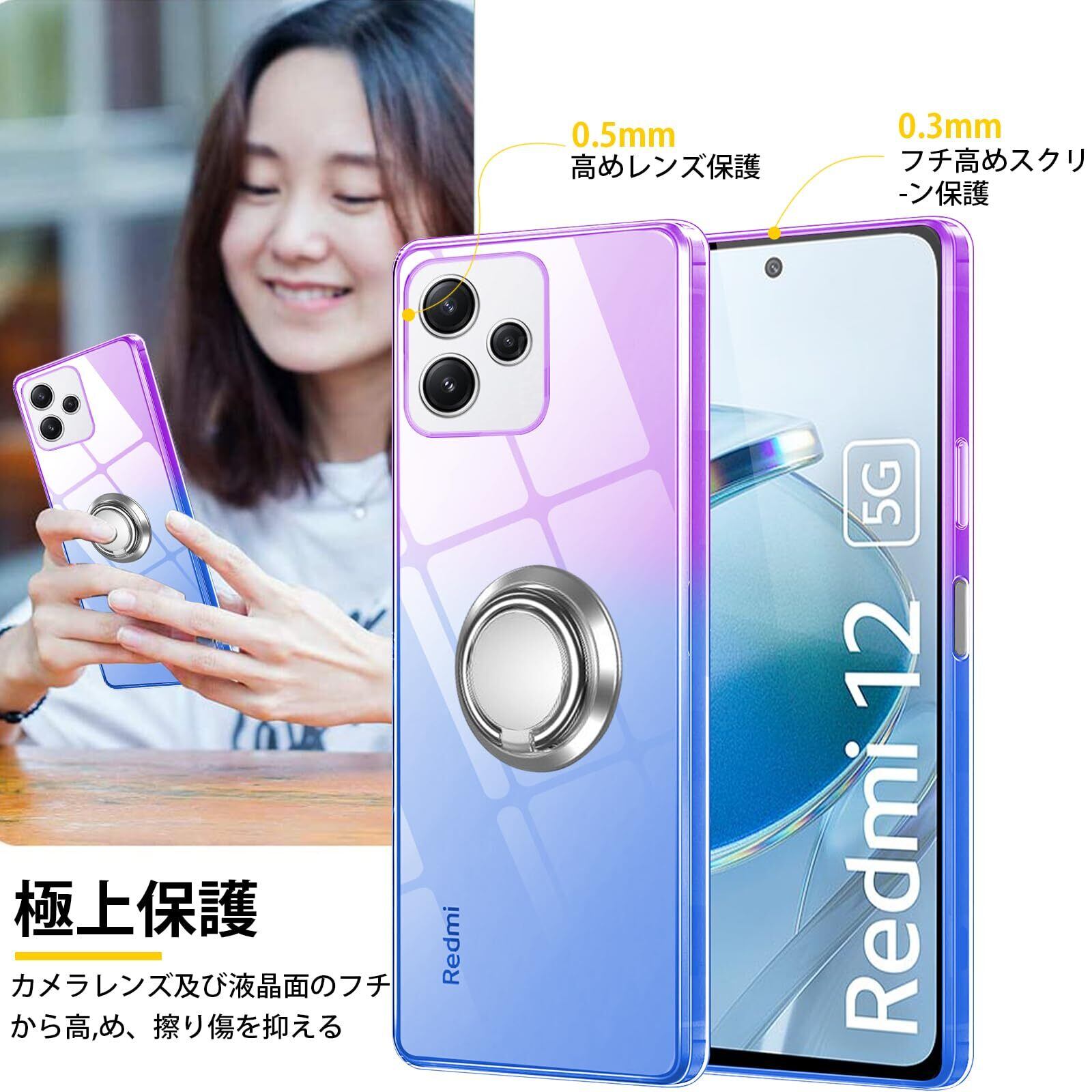 Redmi 12 5G ケースリング TPU 薄型 軽量 グラデーション色 耐衝撃 指紋防止 車載ホルダー対応 防塵 一体型 人気 携帯カバー 全面保護カバー パープルブルー