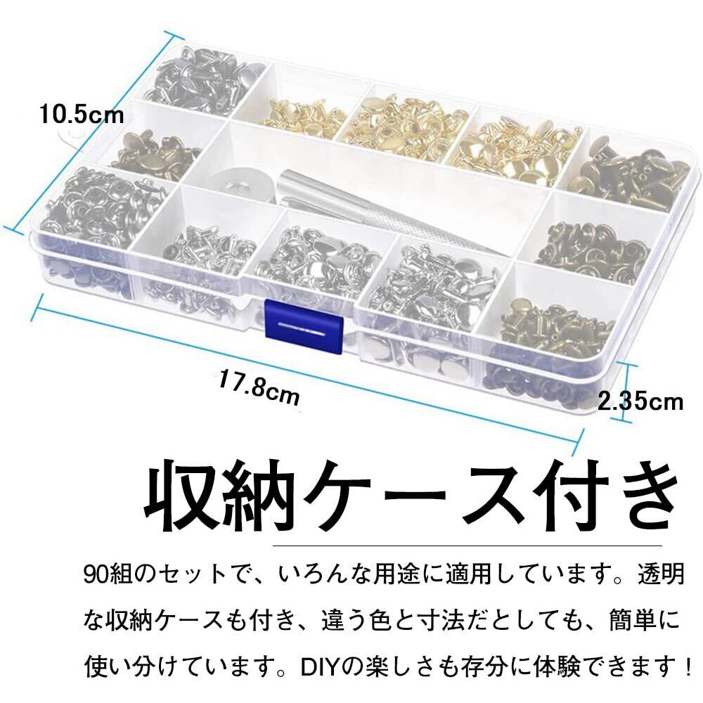 【パッケージ内容】カシメセット*90組;3サイズ (6*6mm/8*8mm/8*12mm)各30組;3種色(ゴールド/シルバー/ガンメタル);工具*3(穴あけポンチ*1/打ち棒*1/打ち台*1);収納ケース*1(ケースサイズ:17.8×10.5×2.35cm)