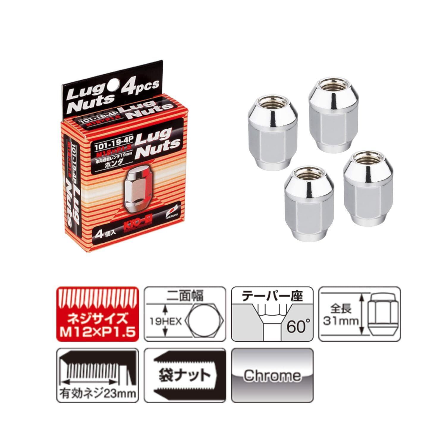 ● 品番 : 101-19-4P ● M12 x P1.5 19HEX ● 袋タイプ ● クロームメッキ ● 4個入