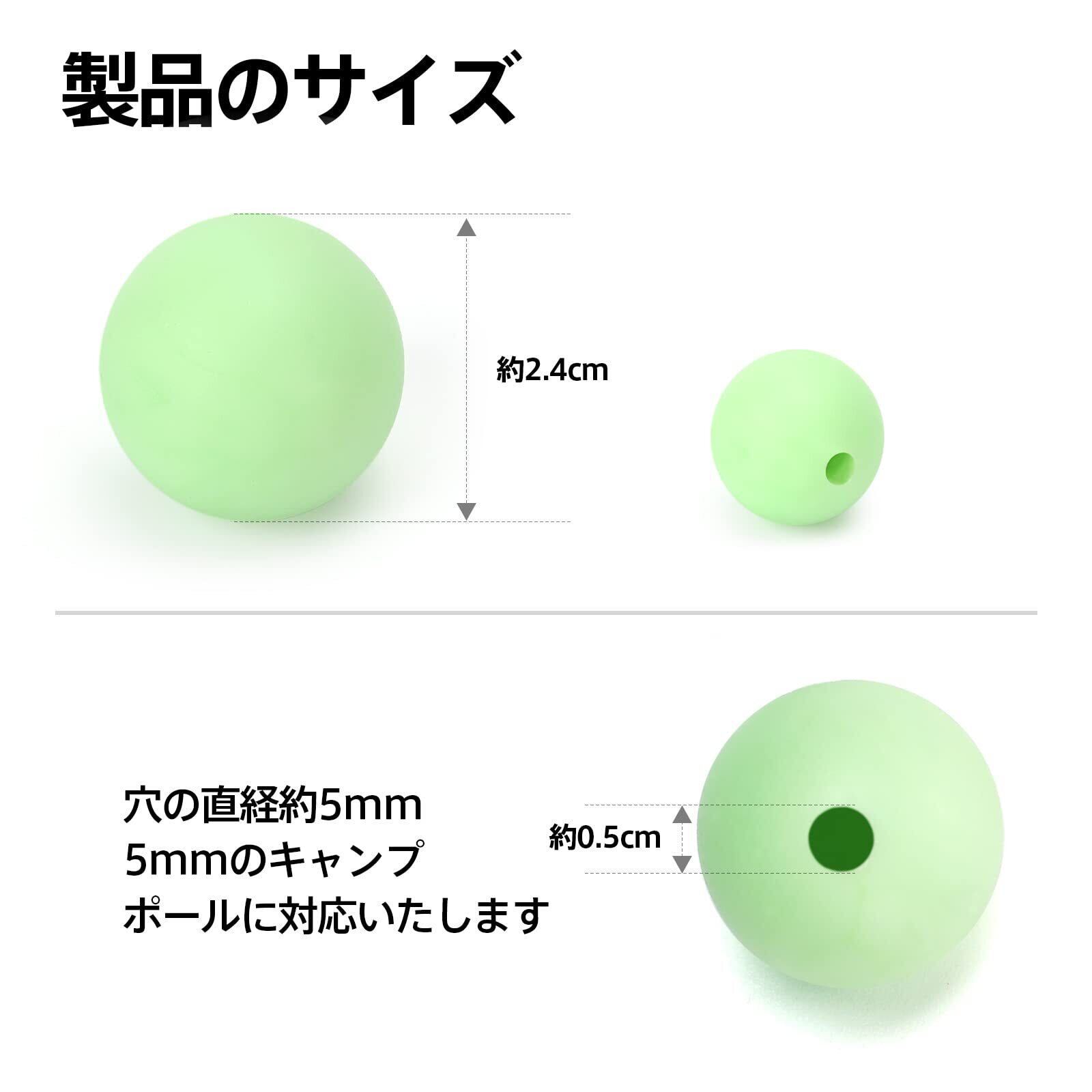 【製品仕様】外側の直経:約2.4cm、穴直径:約5mm(約5mmのキャンプ ポールに対応いたします。) 重さ:約8g。メイン素材:TPR、絶縁素材である