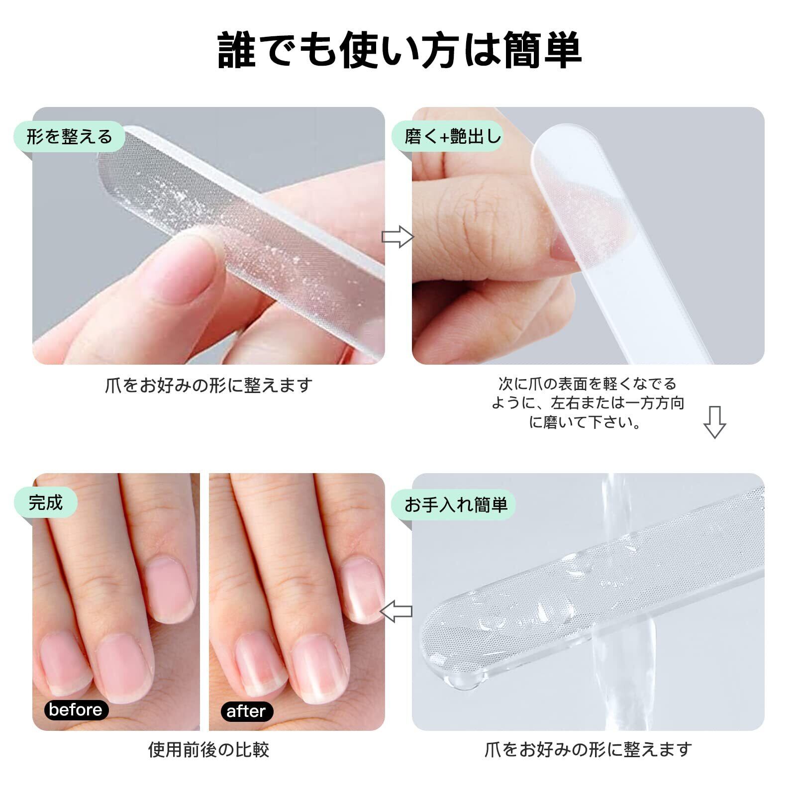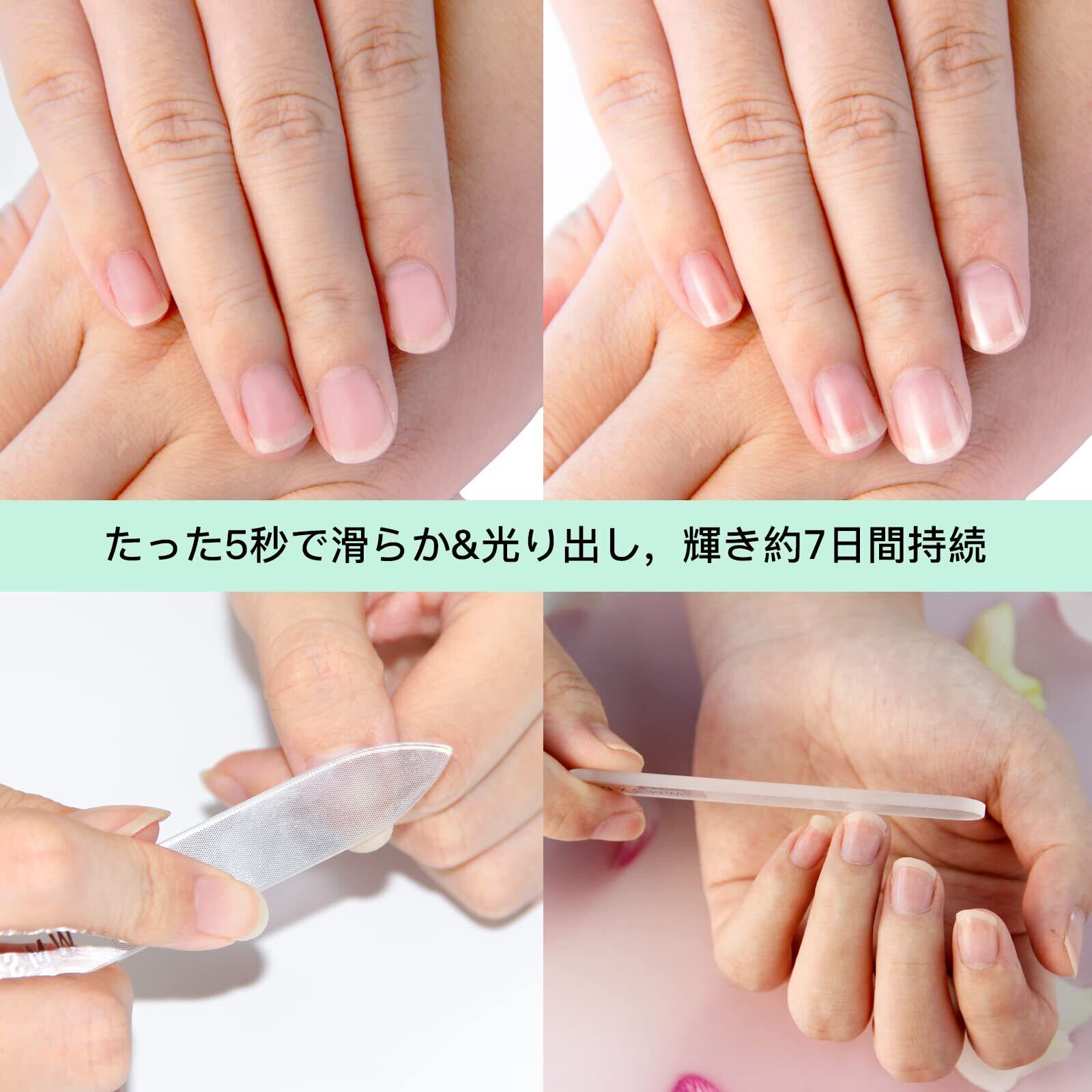 【エコで安全な爪やすり ガラス】この爪 磨きはガラスで作られ、物理的な研磨原理を利用して、最も健康な研磨爪を達成して、ピカピカで滑らかな艶を出す。よく見られる金属爪やすりが爪の表面に与えるダメージはありません。化学マニキュアが不要で健康です。臭いもなく、肌に刺激もなく、皮膚科医が極力おすすめている無害なネイルツールため、妊婦さん 、ギザギザ爪がすぐ伸びてくる赤ちゃん、職業上マニキュアができない方や男性にもお薦めです。※爪に縦ジマや凹凸がある場合はネイルファイルやネイルバッファーで下処理をしておくと均一に磨けます。輝きの持続期間は利用環境や個人差によって異なります。