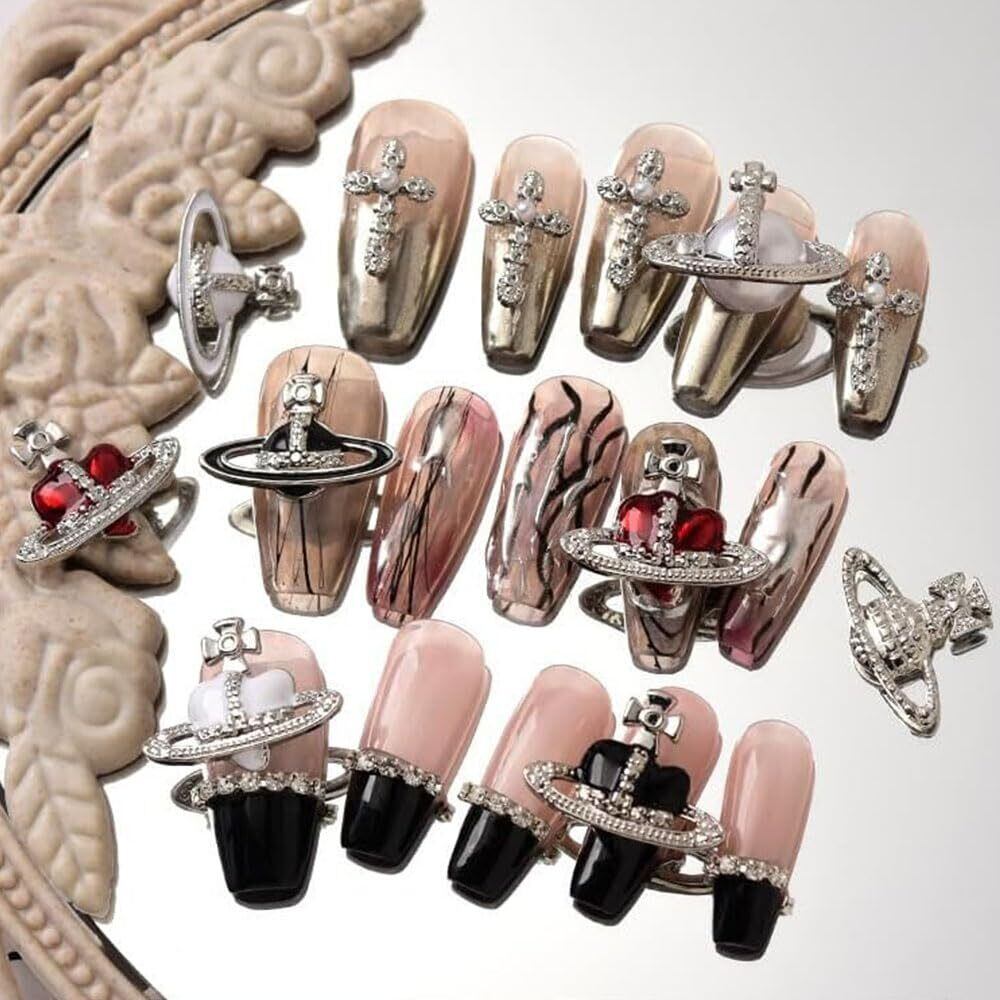 【パッケージ内容】ネイルパーツ約32個セット。十字架、ハート、惑星、真珠など8種類のデザインがあり、各種類4個ずつ。
