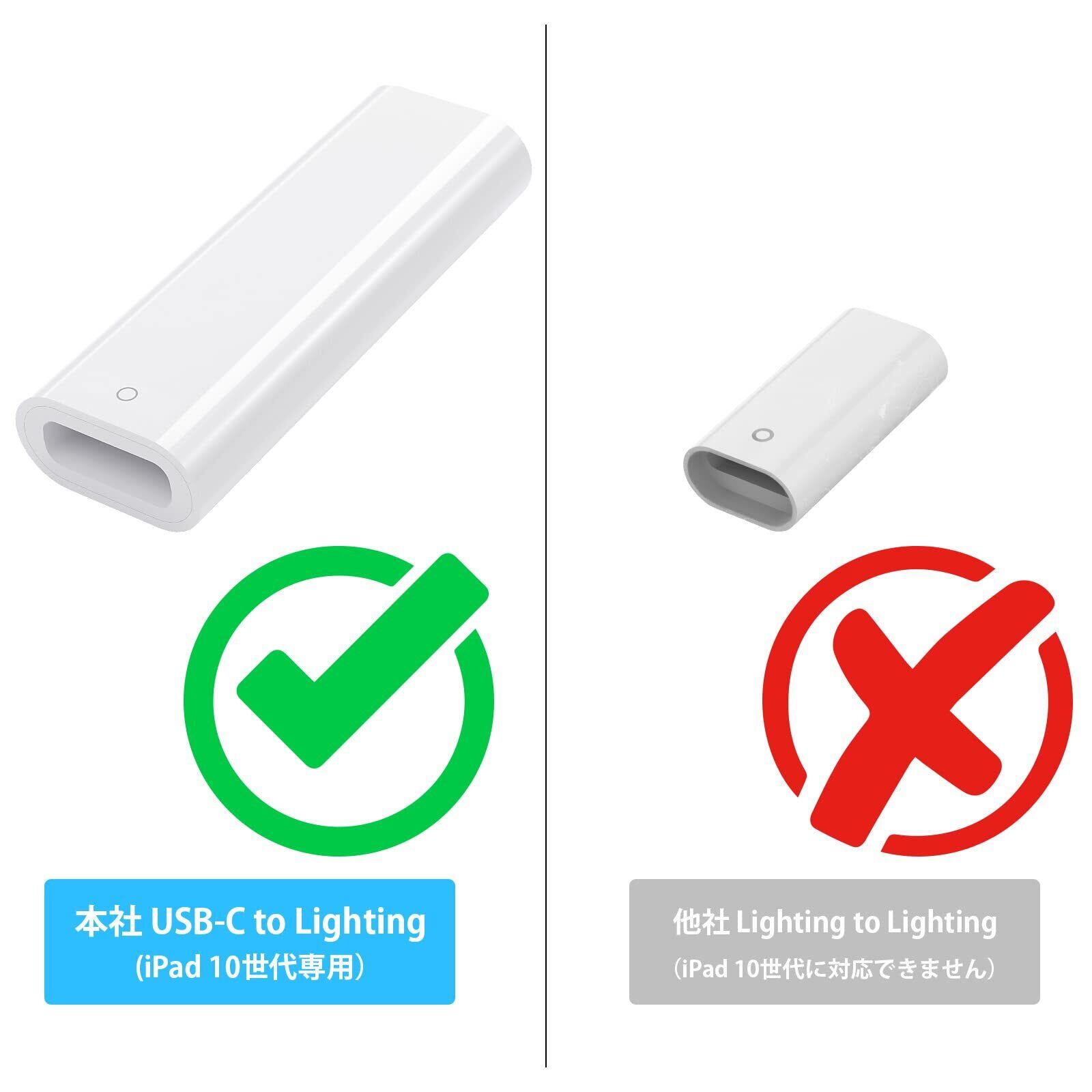 Bluetoothペアリングと充電 2in1:対応Apple Pencil(第1世代)をiPad 第10世代とペアリングしたり充電するには、USB-C - Pencilアダプタが必要です。使い時にiPencilをアダプタの片方(for Lightningポート)に、iPad 10と接続したUSB-C充電ケーブルをもう一方に差し込みます。(注意:対応iPad 10世代/A16本体の設計特殊性により、このアダプターを使用する際にPad第10世代はBluetoothをオフにするとApple Pencilとの接続が解除され使えなくなる。Bluetooth無効化や電源オフ/iPadを再起動してもの後は、アダプタを使って再度ペアリングが必要です。ペアリングまたは充電中に問題が発生した場合は、Web サイト最後にある詳細な手順を参照してトラブル検査を行ってください。)