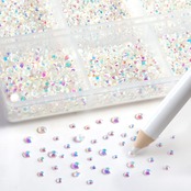 1箱パック、6サイズ計7,200個のトランスペアレントABネイルラインストーン入り、小さなラインストーンピッキングペン付き。メイン写真のアクリルネイルは含まれていません。小さいサイズのネイルラインストーンを見せるために使われているだけです。