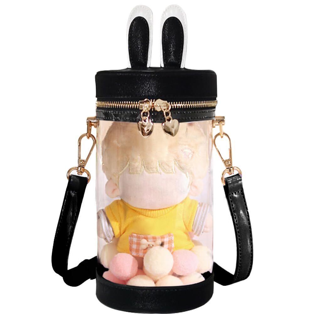 外観:バッグの蓋はウサギ耳付き、バッグの底部は全面の透明デザイン、内部に見せたいアイテムを好みにアレンジでき、水と塵からぬいぐるみなどを保護しくれます。円筒形バッグ、蓋はジッパーのデザイン。ショルダーストラップ付きます。