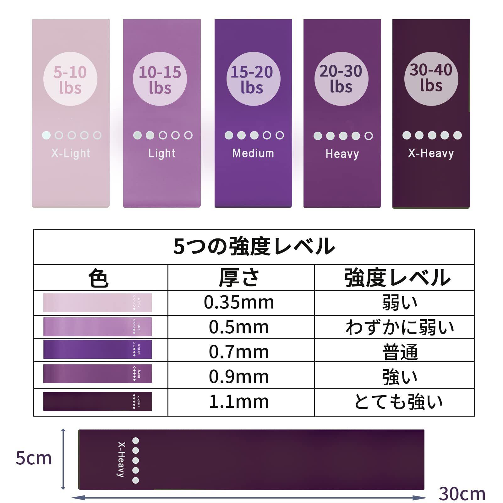 【初心者でも始めやすい5つの負荷強度トレーニングチューブ 】 強度は色によって異なり、それぞれX-Light(最弱)-Light(弱)-Medium(普通)-Heavy(強)-X-Heavy(最強)となっています。負荷は5種類から選べるので自分に合った強度でトレーニングできます。