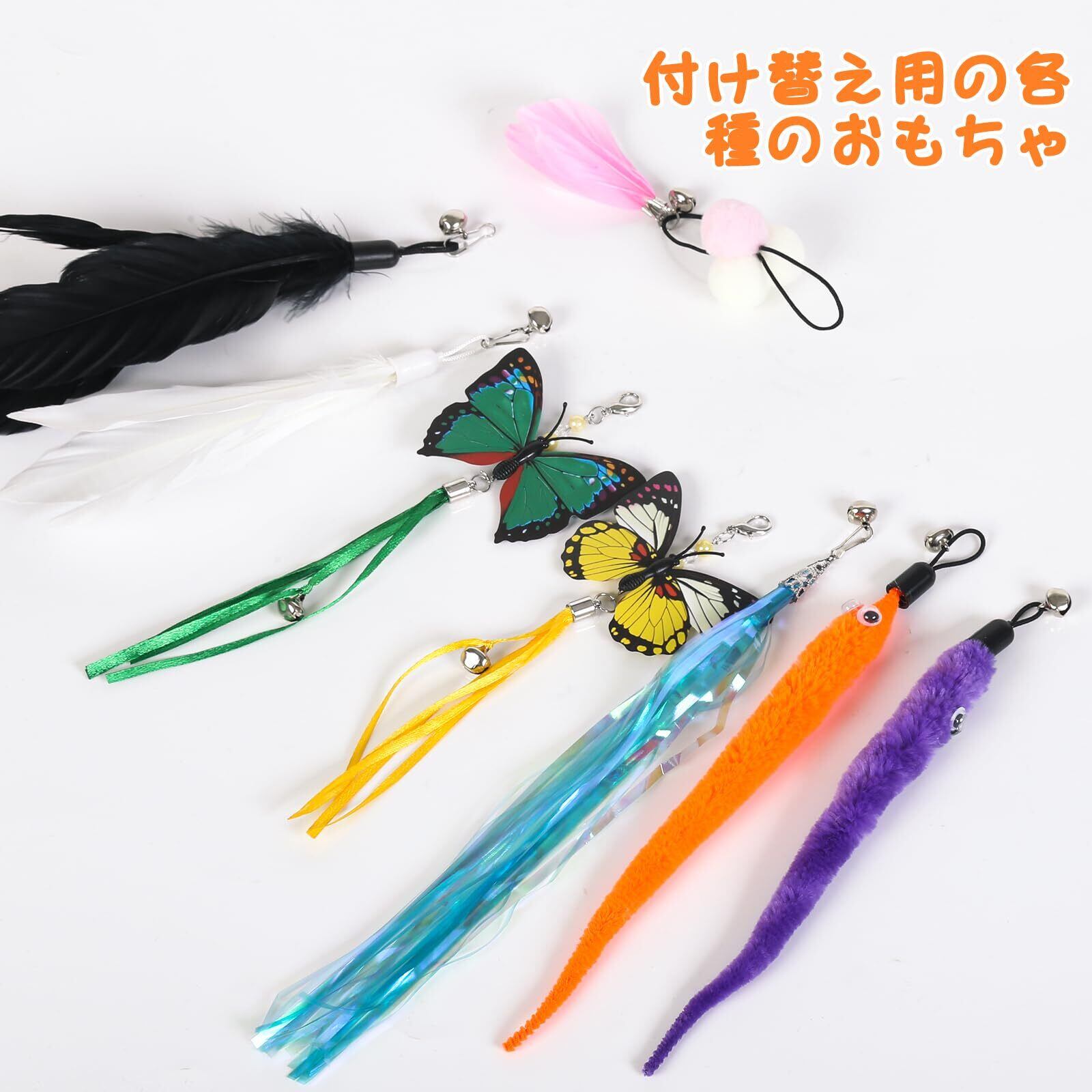「セードの内容」 猫じゃらしに複数の取替の猫おもきゃが含まれます、セードの内容は黒い羽×1、白い羽×1、ピンクの羽×1、黄色の蝶(青いの蝶どランタイムでいれます)×1、緑の蝶×1、毛虫×2、リボン×1。