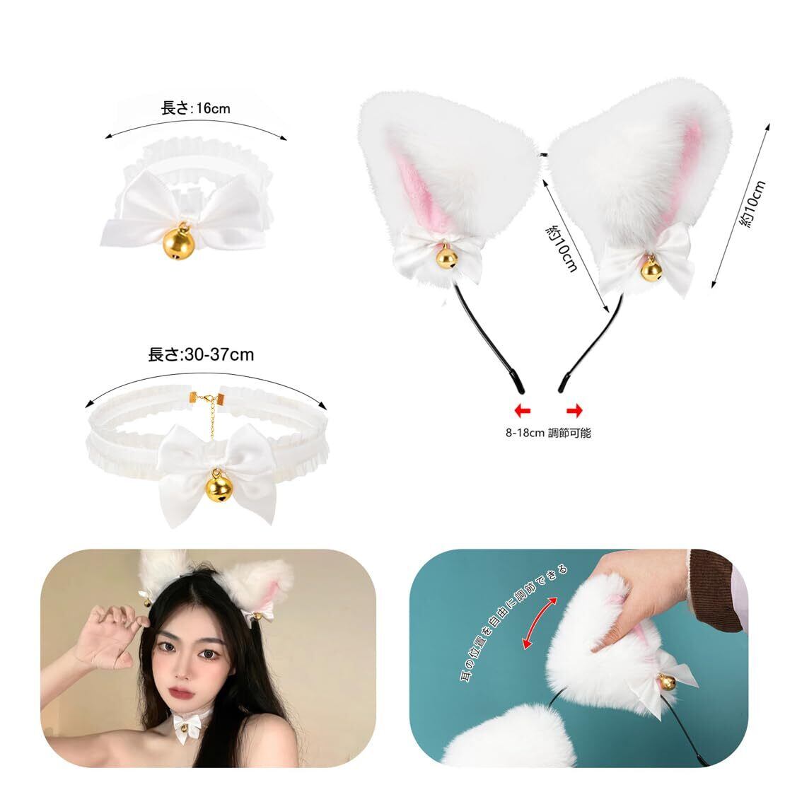 Sucodver 猫耳 カチューシャ 肉球手袋 尻尾 チョーカー 手首飾り 厚手 鈴付き ふわふわ ハロウィン コスプレ 小物 5点セット (ホワイト)