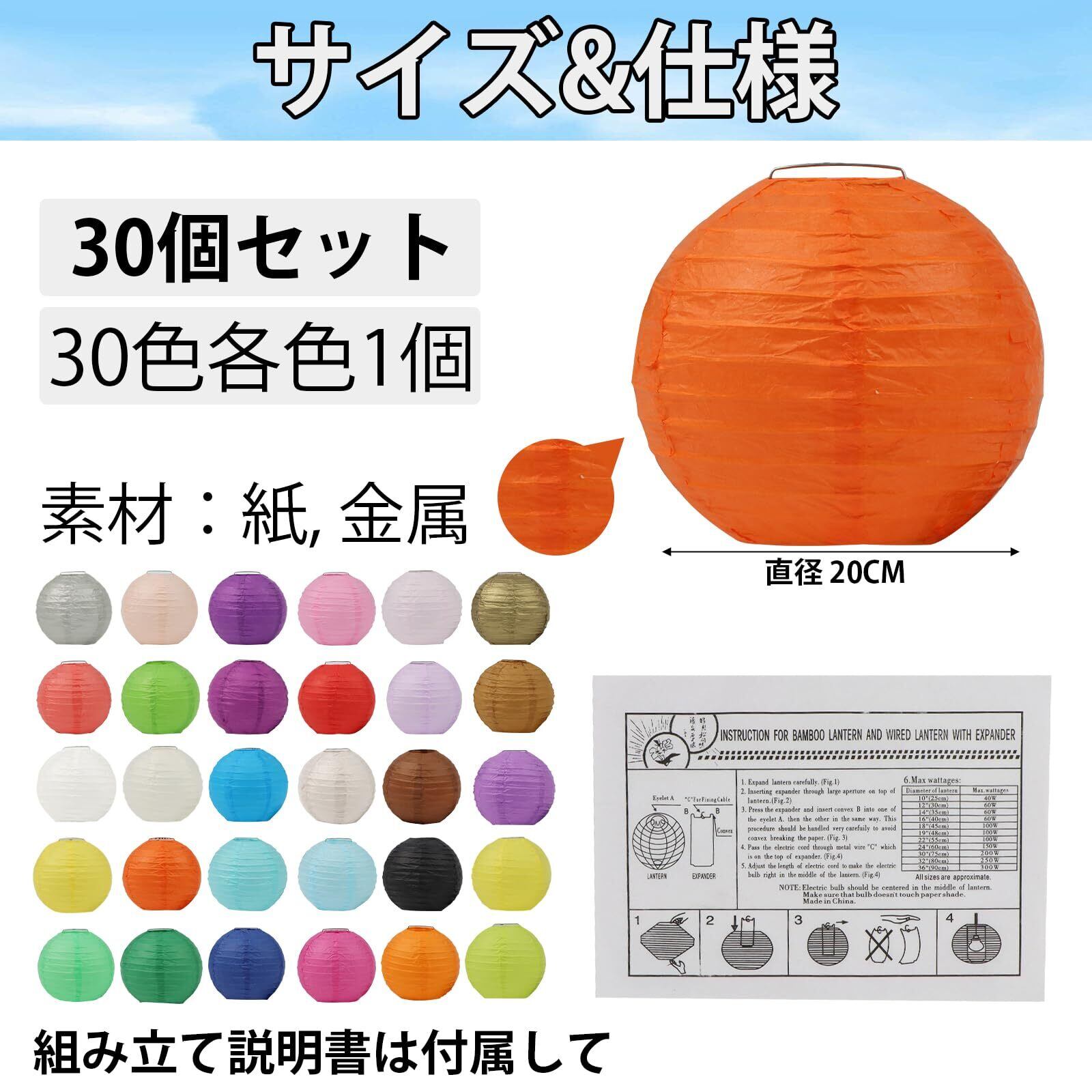 【仕 様】パッケージ内容:30色合計30個丸型紙提灯セット入り;サイズ:直径20cm、材質:落水紙・金属サポート。靭性と延展性に優れの提灯専用「落水紙」を採用して作られた 、高品質で長持ちします。