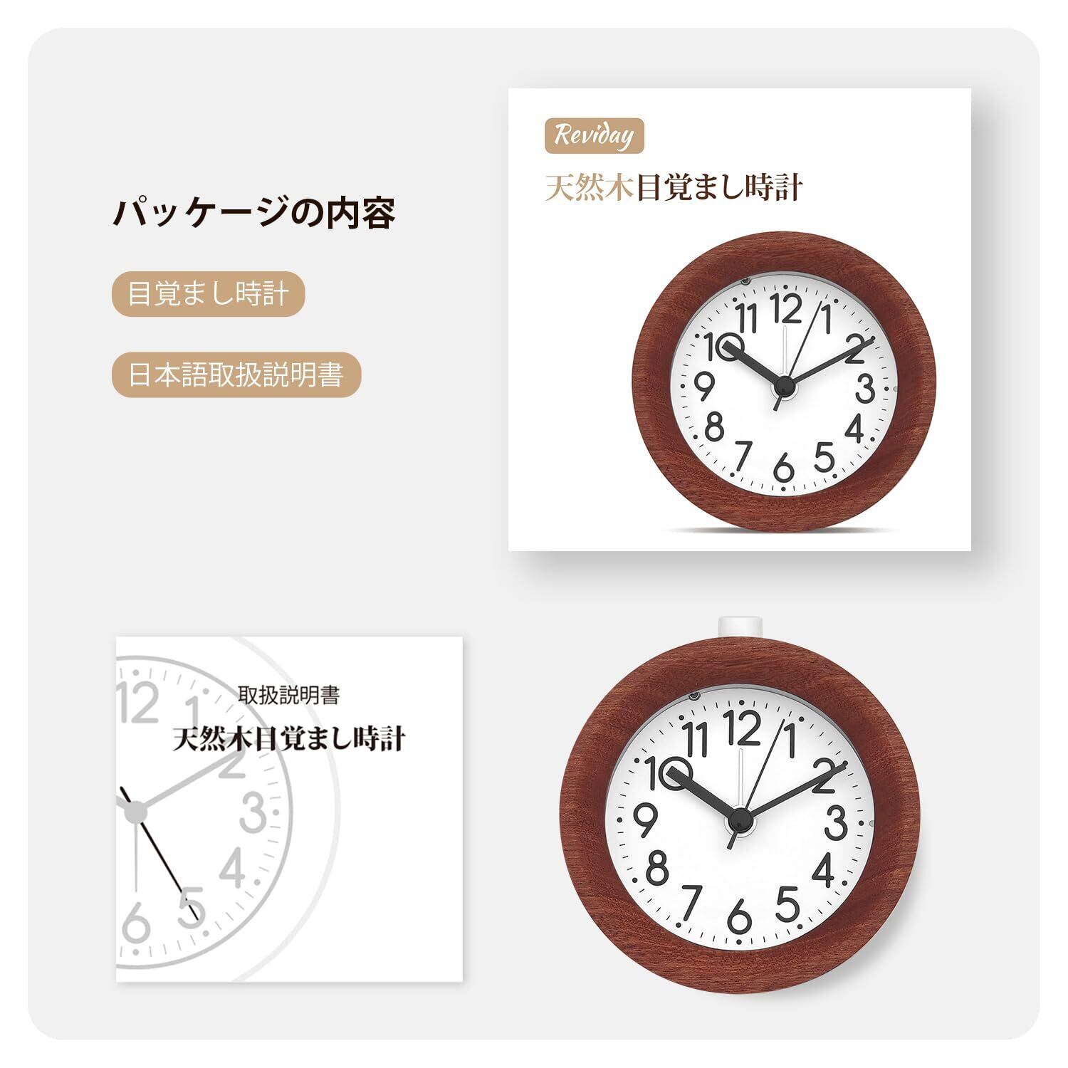 Reviday 目覚まし時計 木製 アナログ 置き時計 アラーム おしゃれ スヌーズ付き 小型 静音 連続秒針 レトロ 電池式 照明ライト付き(乾電池付属無し)ブラウン