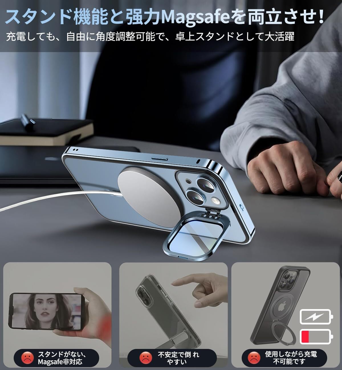 【スタンド機能とMagsafe対応を両立させ!】Magsafe機能とスタンドは別々に使わなければならない?NO!このアイフォン13 mini ケースは、内部には強力な磁石が搭載されており、固定が一瞬で完成します!スタンドはMagSafe機能に干渉しません。MagSafe充電をしてもスタンドを使用でき!そして、磁石と革新的なCDパターンを完璧に融合させ、iPhoneをより高級に演出します。また、すべてのMagSafeアクセサリーとワイヤレス充電器に対応しています。ケースの脱着の手間もなく、ご自宅・外出先での生活をもっと便利に。