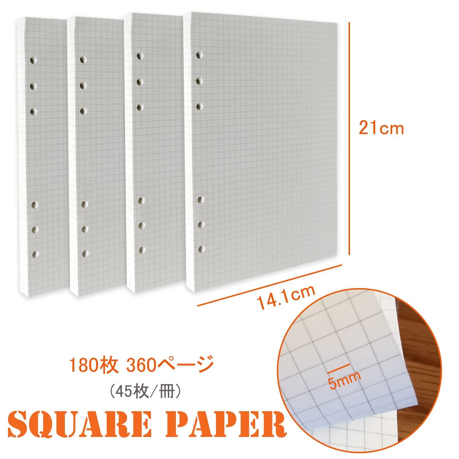 1、【お得な180枚セット】:サイズ:A5(21.0×14.1cm)6穴; 仕様:方眼罫 幅:5mm ; パッケージ内容: A5リフィル*4冊 枚数:4冊*45枚 合わせて180枚360ページ; 経済的で大容量な180枚入り、使用頻度の高いミニ6穴システム手帳に最適