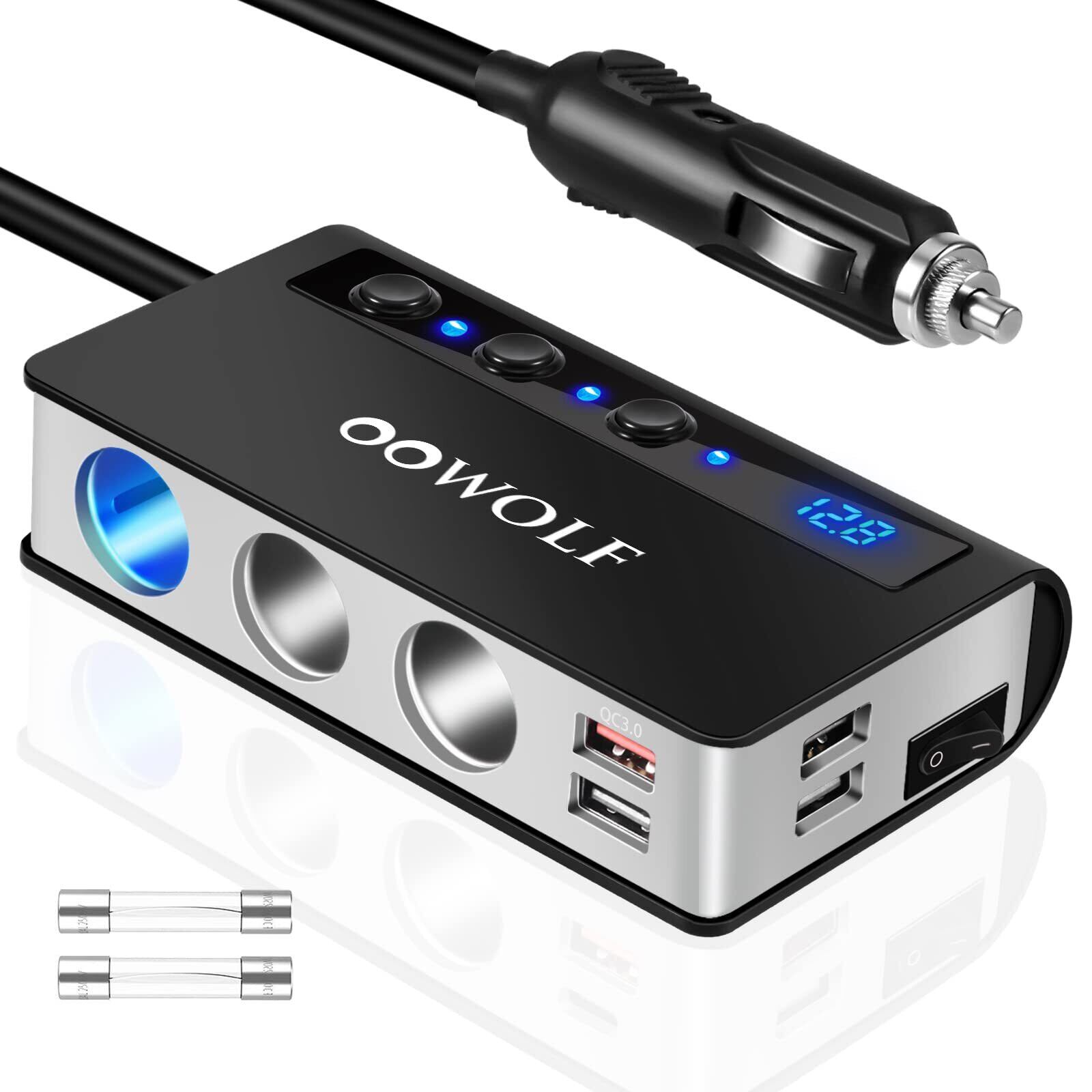【2022最新】OOWOLF シガーソケット 3連 4ポート付き USB充電器 最大180W スマートIC 急速充電 増設 カーチャージャー 【Quick Charge 3.0 搭載】 12-24V車対応 独立スイッチ シガーライター機能搭載 1mケーブル 電圧測定 電源ソケット 分配器 取り替えヒューズ2個付属 | allstore2