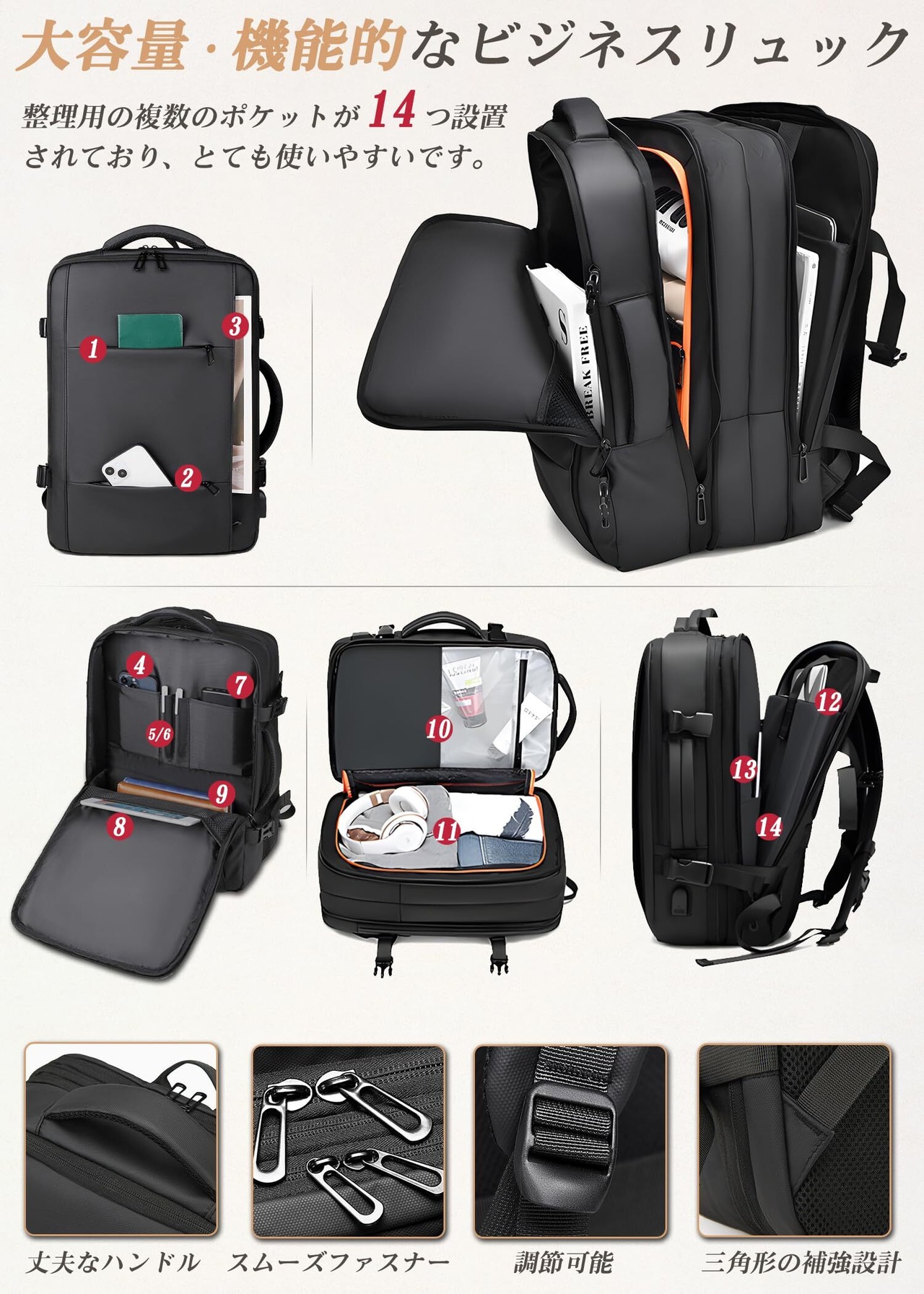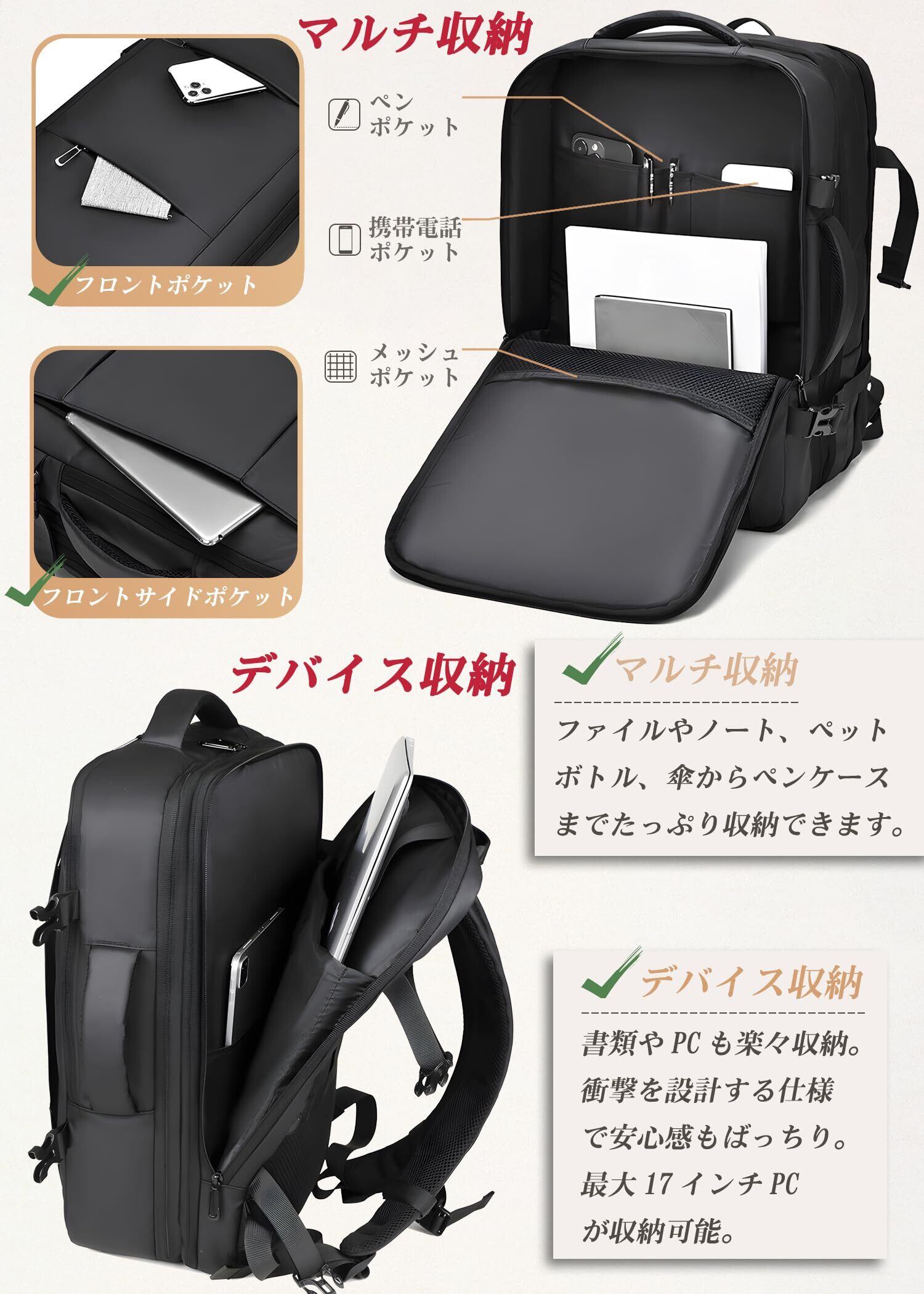 【40L大容量・機内持込】サイズ:49*33*14cm(拡張前:23L)/49*33*25cm(拡張後:40L);機内に持ち込み可能です。メイン収納部、PC収納ポケット及びフロントポケットも備える3wayリュックです。40Lメイン収納部はスーツケースのように開閉でき、出し入れが非常に簡単、最大4泊分の着替えも収納可能。荷物が少ない場合は、サイドのジッパーによりこのリュックをよりコンパクトにすることができます。