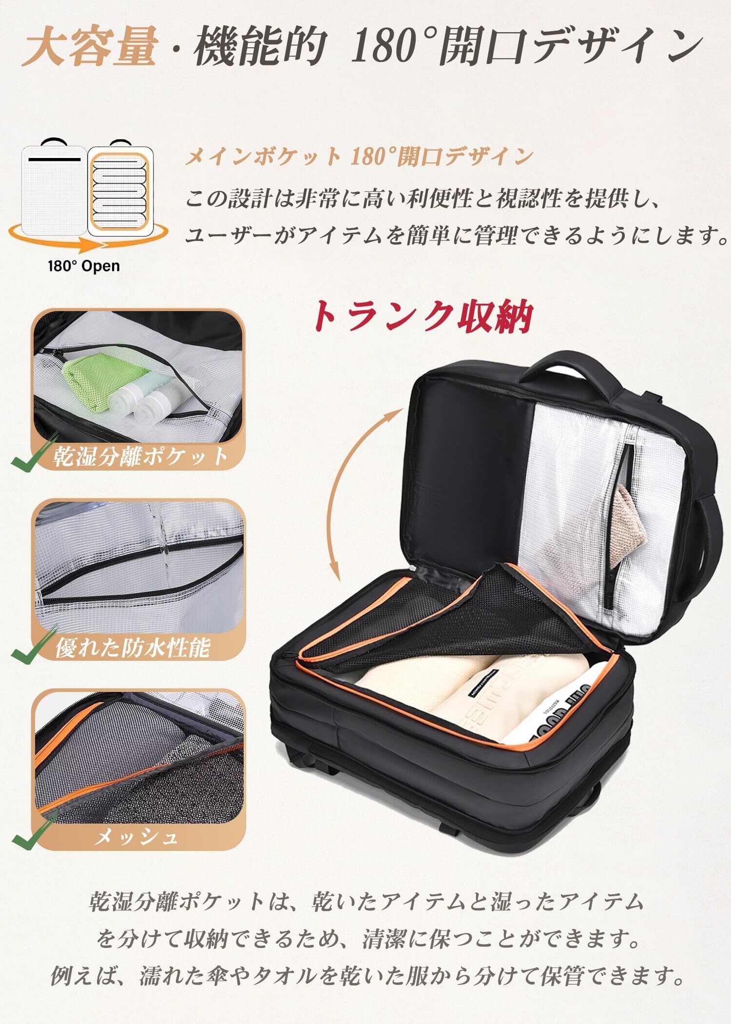 【大容量·180°開口デザイン】大容量メイン室は、23Lのスーツケースと同等の容量を持ち、3泊4日分の荷物を問題なく収納できます。このメイン室はスーツケースのように180°開くことができ、荷物の整理整頓が非常に簡単になります。さらに、内部にはジッパーレイヤーが備え付けられており、荷物をしっかりと固定することができます。