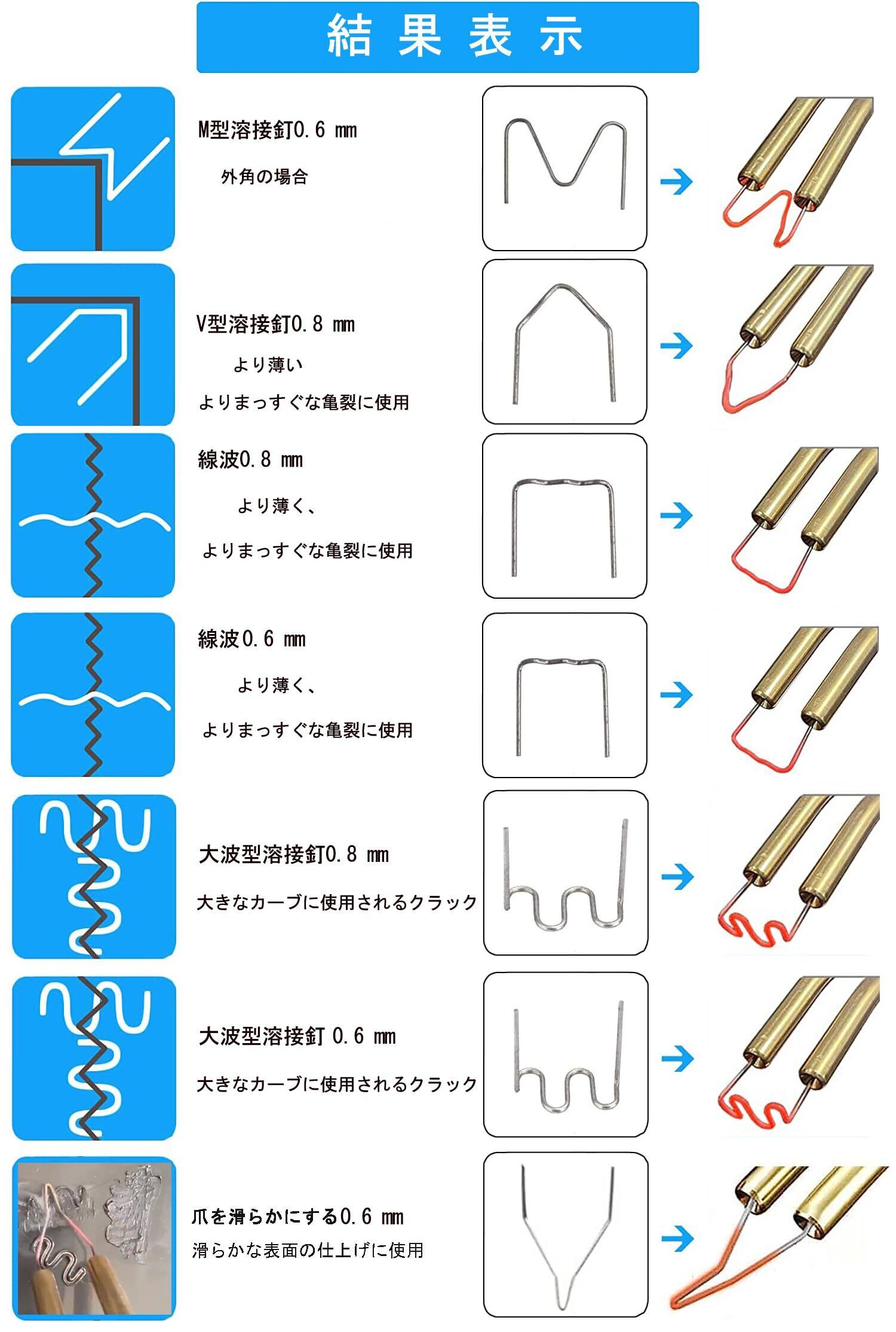 包装が完備: 専用110V/70W プラスチック溶接機1本、溶接釘300個(0.6mmM型溶接スタッド50個、0.8mm V型溶接スタッド50個、0.8mm大波状溶接スタッド50個、0.8mm小波状溶接スタッド50個、0.6mm大波状溶接スタッド50個、0.6mm小波状溶接スタッド50個)、10個平らにするための溶接釘、1個美工ナイフ、 紙やすり3枚、1個日本語の説明書、熱溶接面を整理することが役に立ち、滑らかで美しく、手間が省ける。