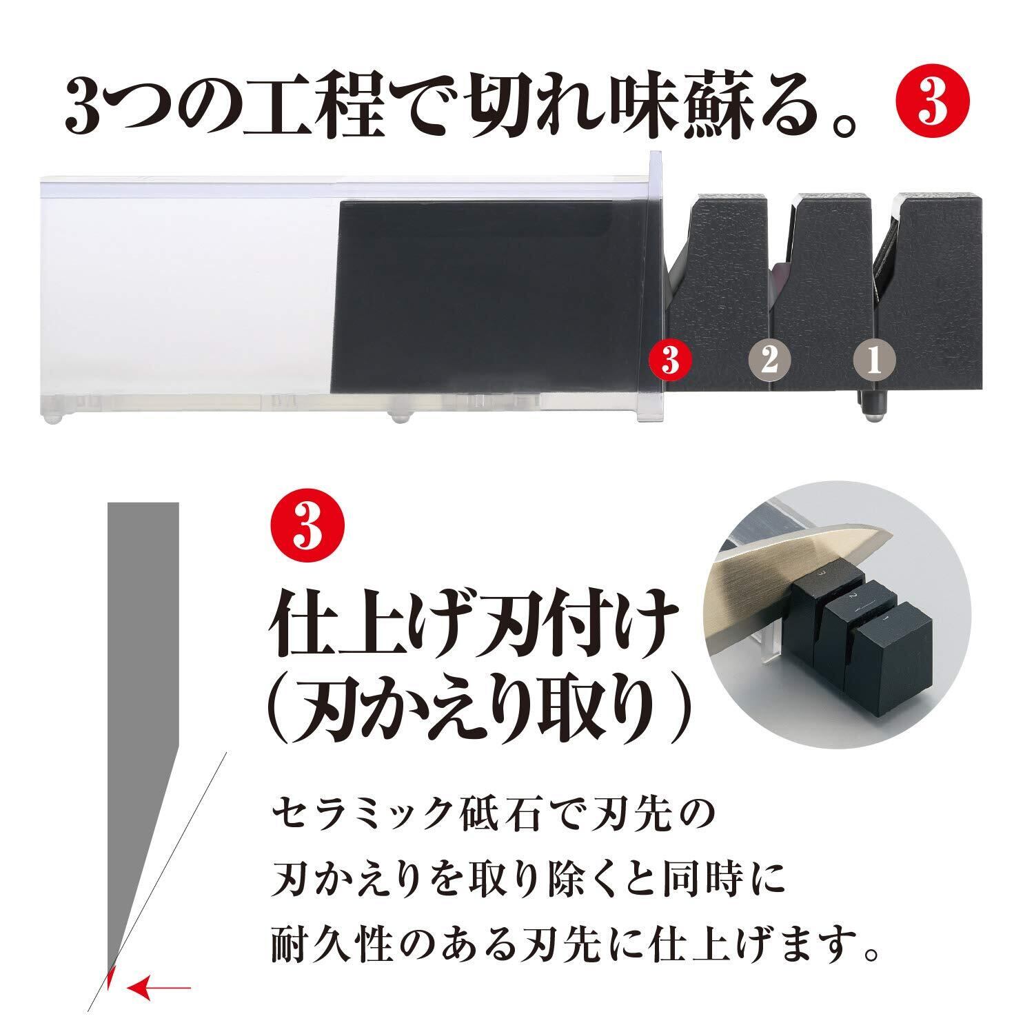 性質の違う3種類の砥石が1本についており、これらを順番に使うことで、切れ味が落ちてしまった包丁の切れ味を簡単に蘇らせることができます。