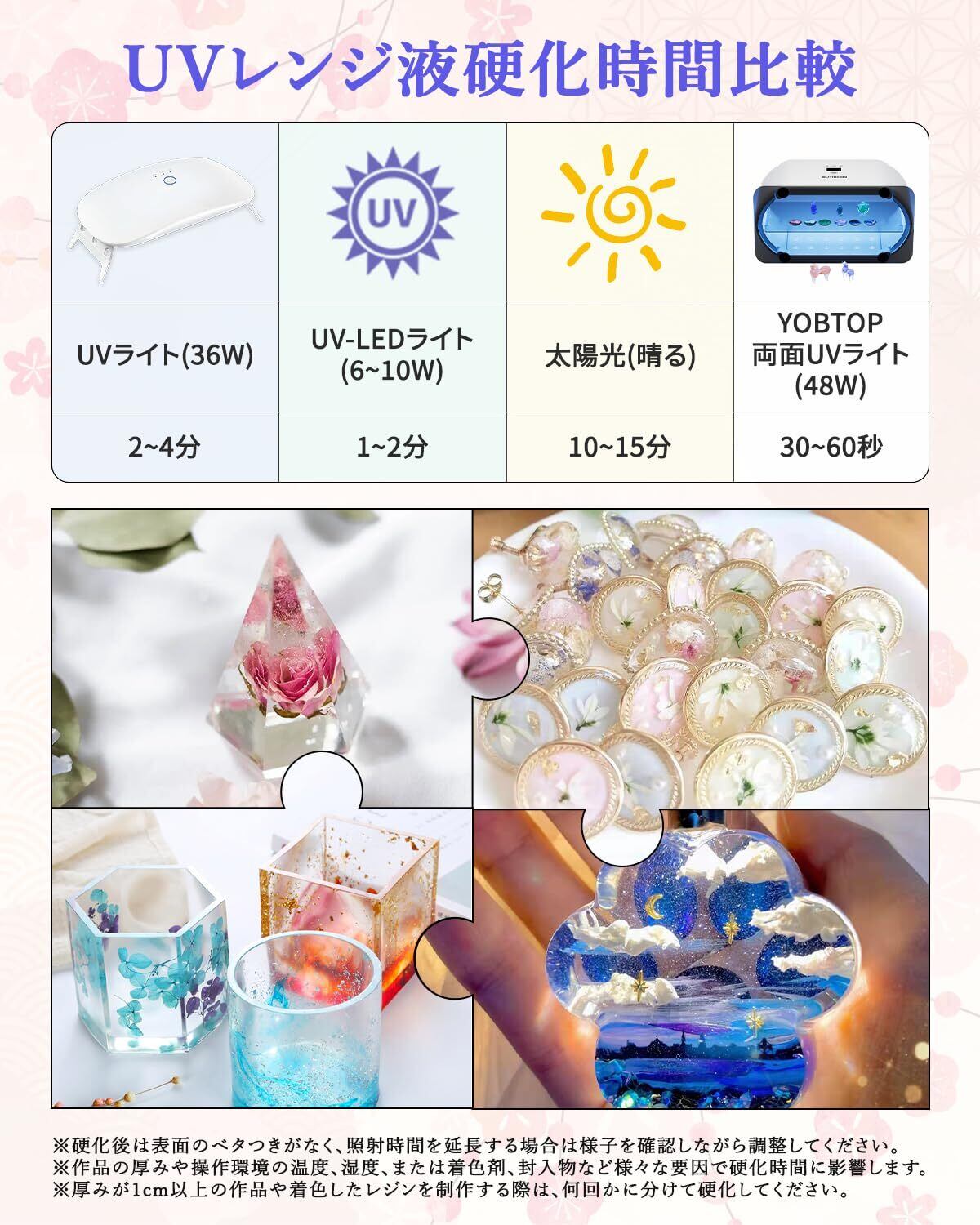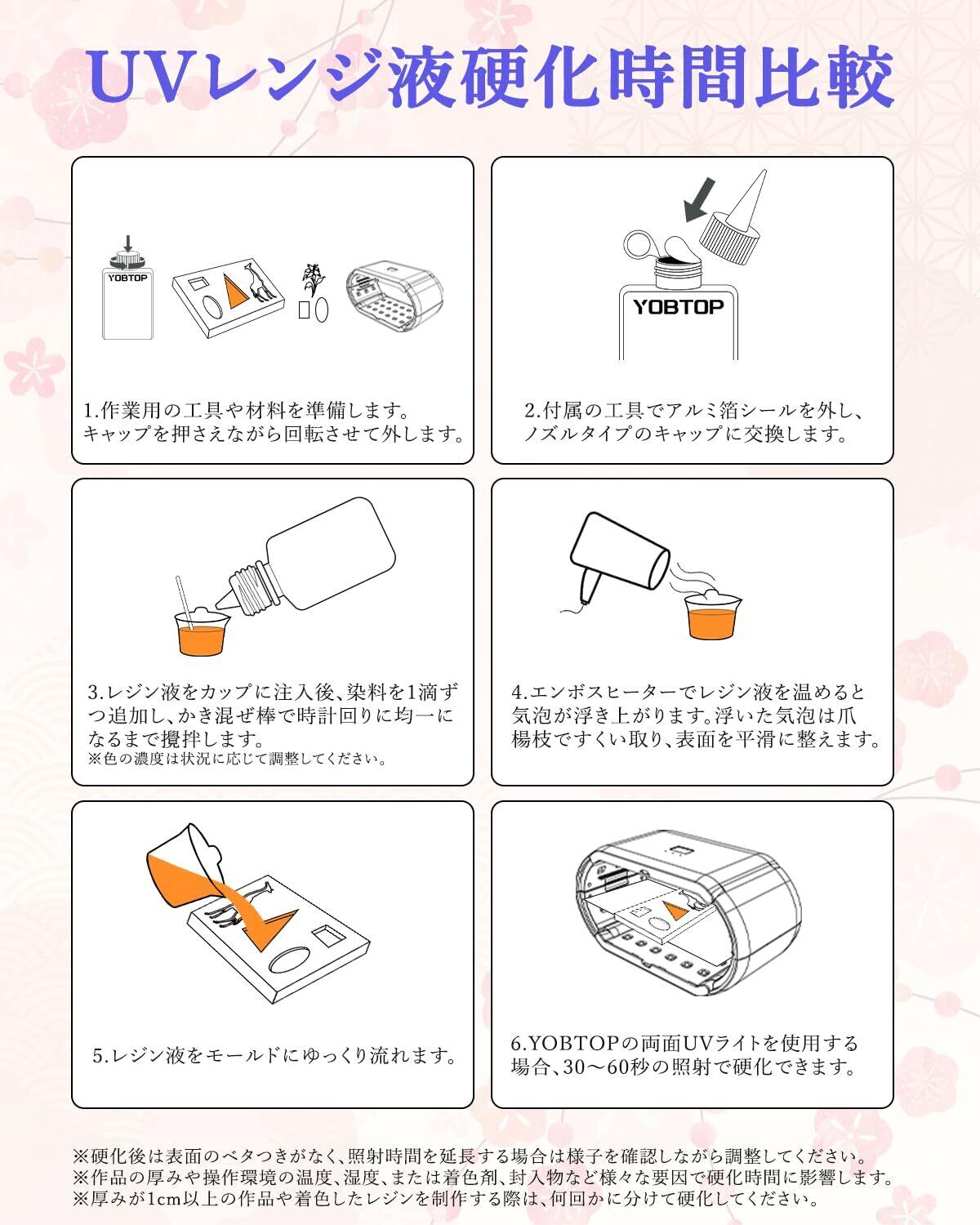 【急速に硬化】レジン液大容量はUVランプと併用することができ、UVライトの下では2~4分、太陽光の下ではわずか8分で硬化する。着色料やスパンコールが多すぎる場合や曇天の場合は、硬化時間を長くする必要がある。(顔料の添加量はUV樹脂の総重量の5%を超えないことが推奨される。)