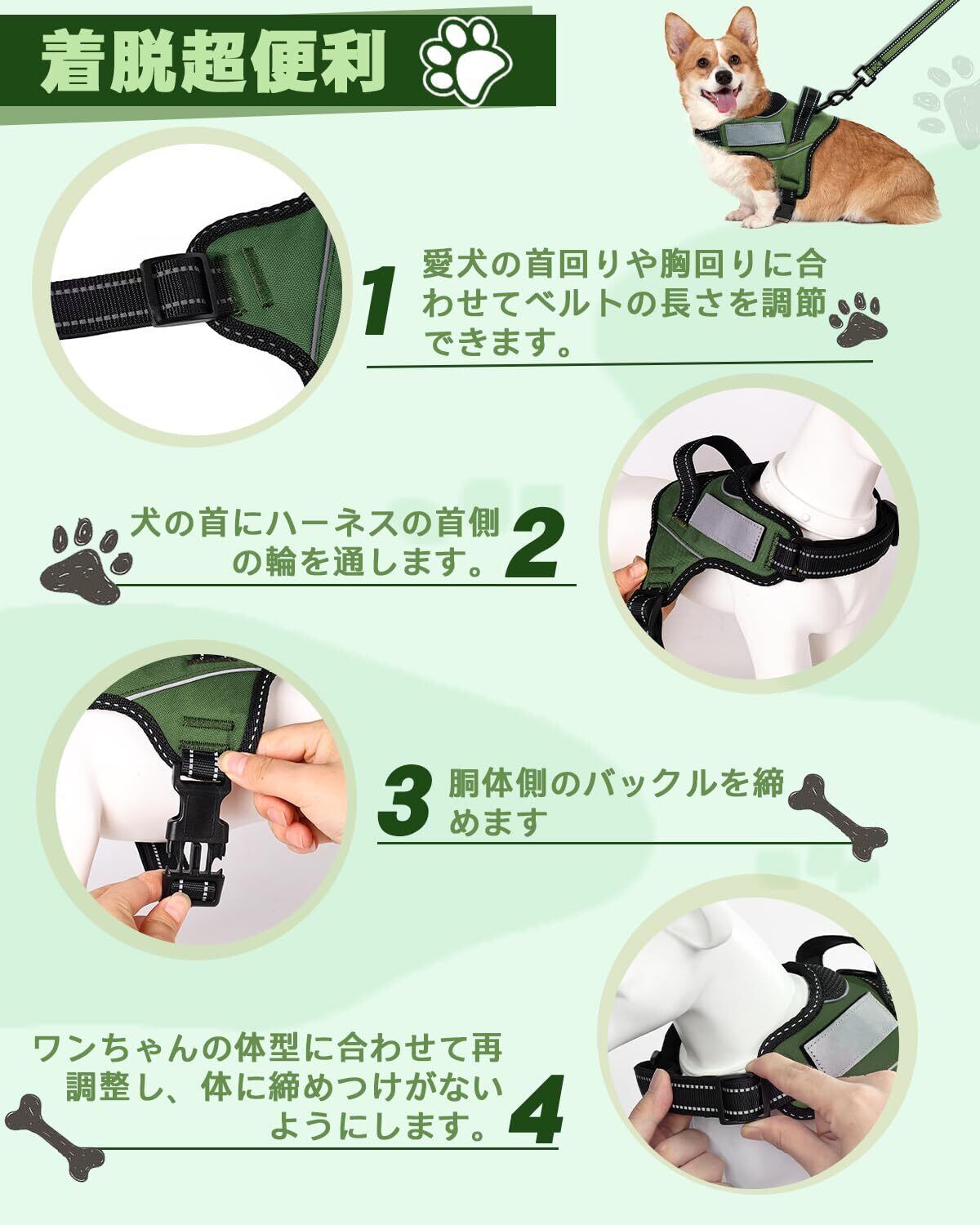 【3秒着脱超簡単】1、犬の頭にハーネスの首側の輪をかけます2、胴側のベルトのバックルを留めます3、完成しました。首と胸に2つの調節可能なストラップ、犬のサイズに合わせて調整でき、成長期の犬にも適しています。フィット感が得られます。