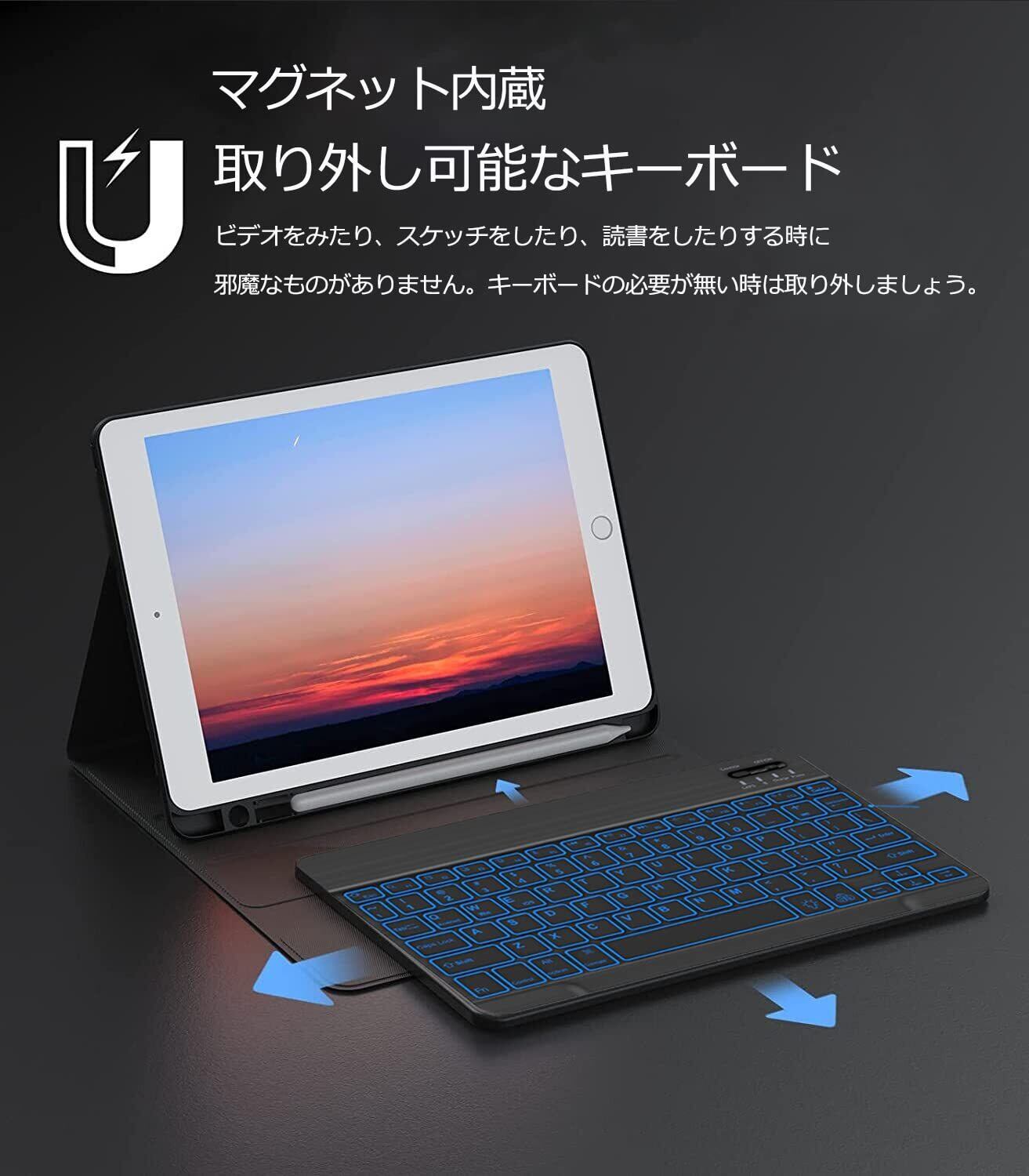 【在庫処分】【2024年進級版】 iPad 6世代 キーボード 7色バックライト iPad Air 2 キーボード付きケース 軽量 ペン収納 ワイヤレス bluetoothキーボードカバー 脱着式 耐衝撃 iPad 第5世代/Pro 9.7インチ兼用 オートスリープ機能付き 多角度調整 全面保護 ブラック