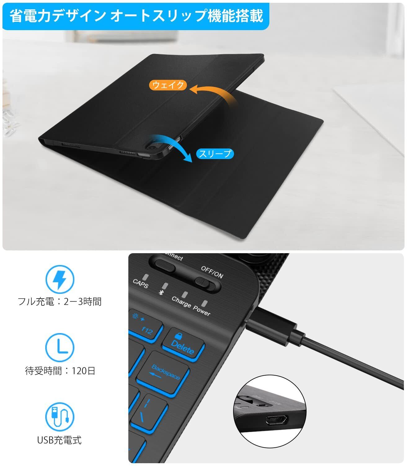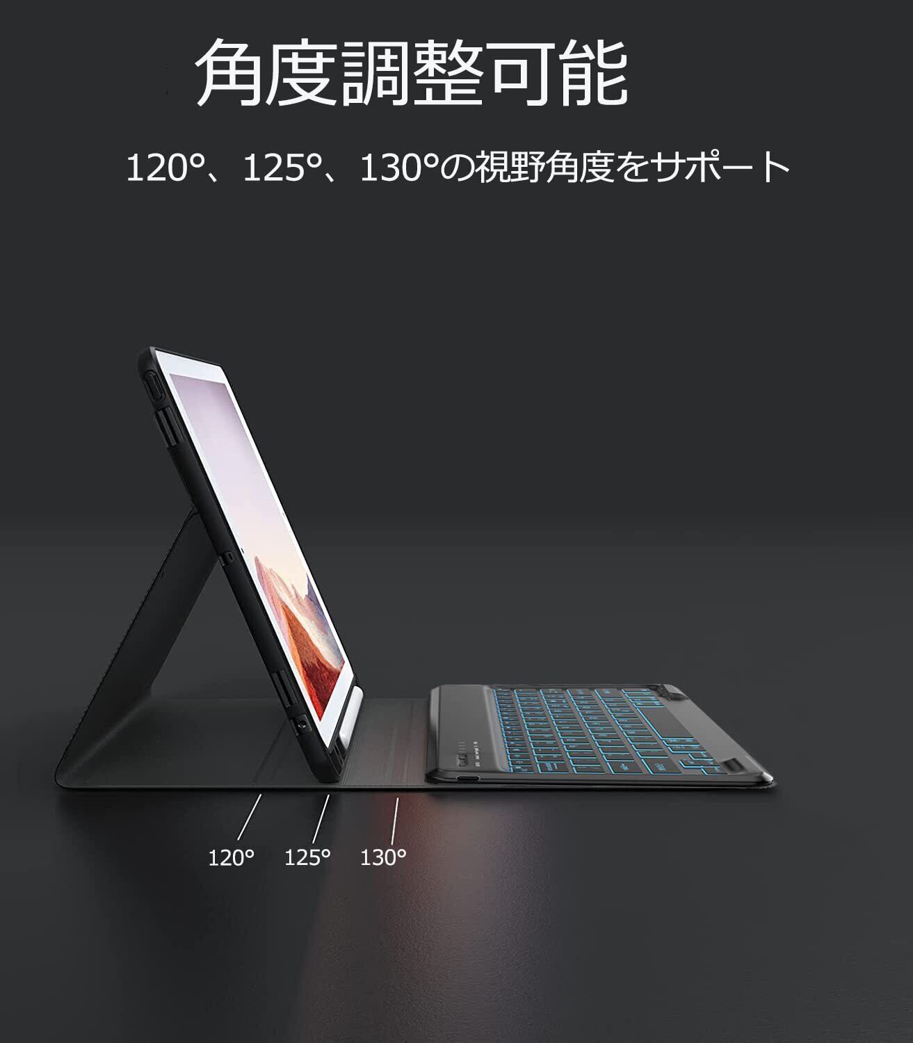 【省電力デザイン&7色変換&3段階調光】ipad 第6世代 キーボード付きケースは自動オートスリープと自動ウェイクアップの機能搭載なので、電池の消耗を軽減させます。iPadケースを開閉すると、iPadは自動的にウェイクモードまたはスリープモードになります。7色LEDバックライト変換と3段階の輝度を調整できます。暗い場所でもバックライト付きBluetooth キーボードを使用可能でき、快適なタイピング体験をもたらします。