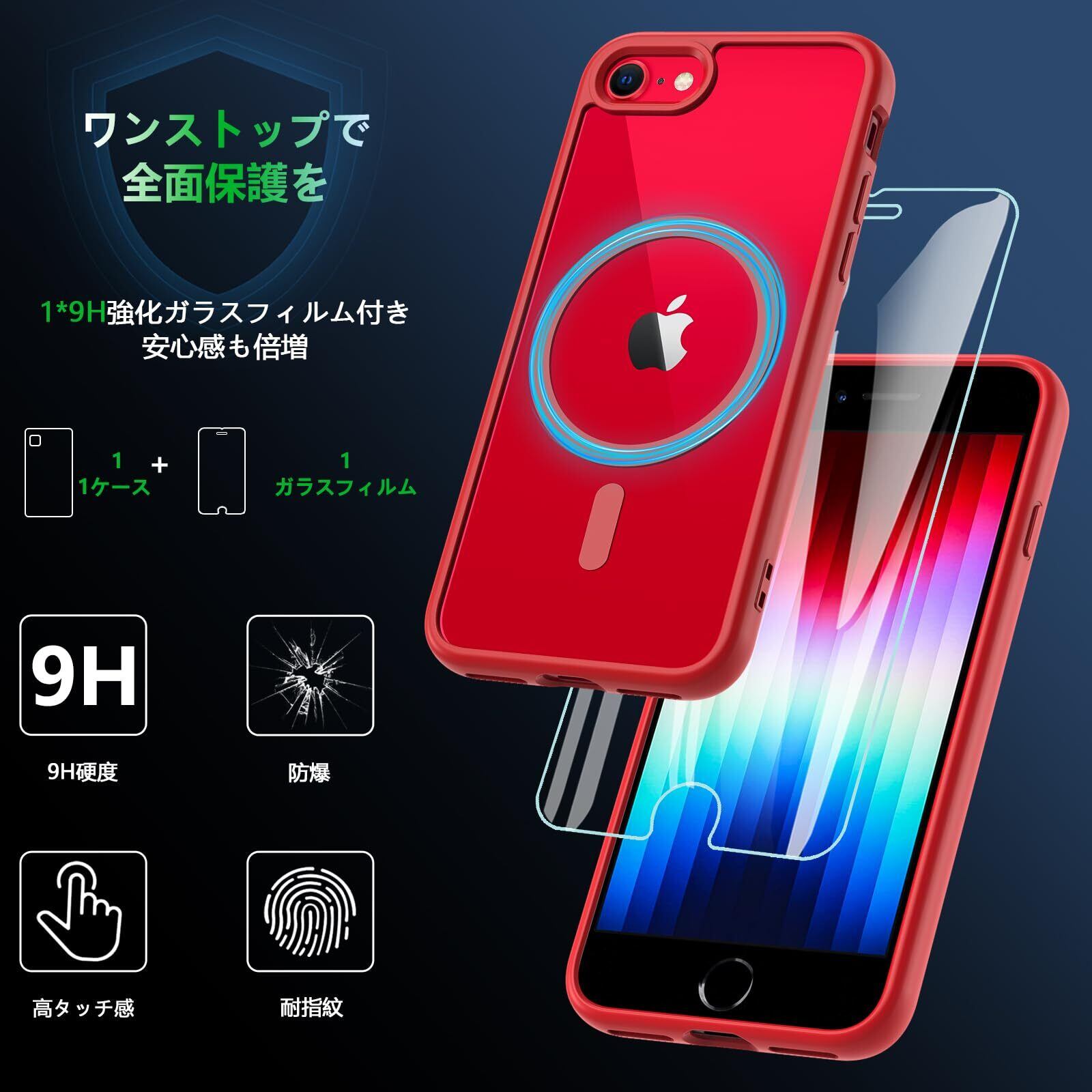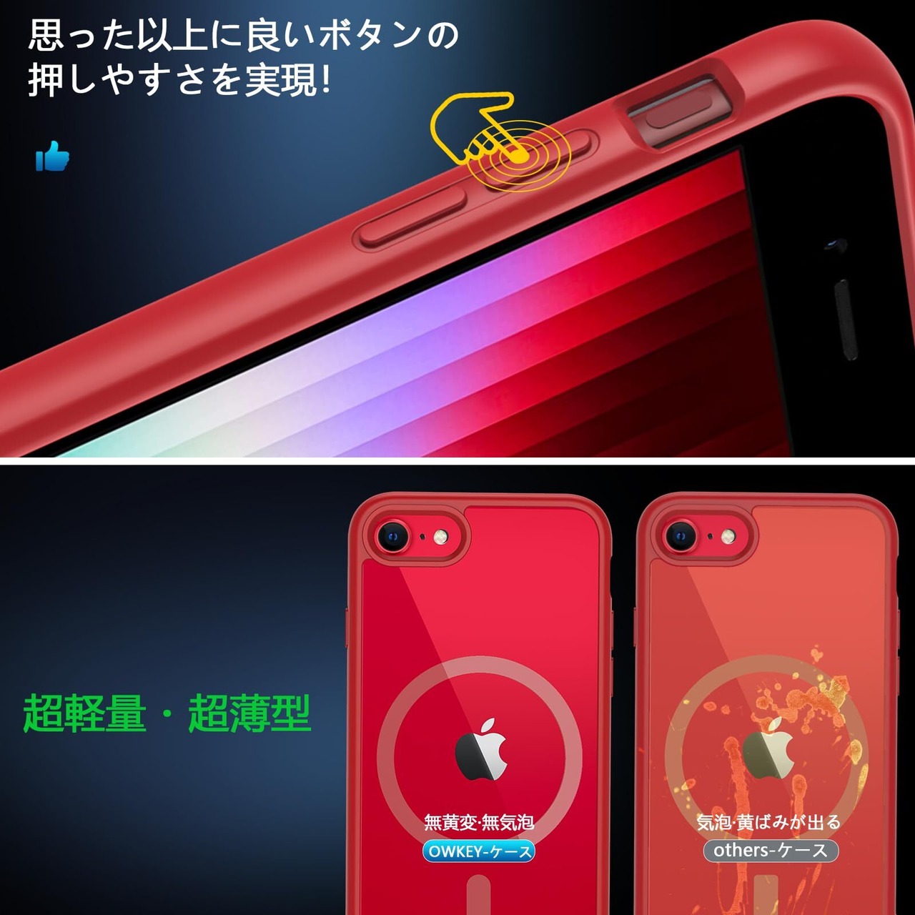 OWKEY iPhone SE ケース iPhone SE3 ケース【ガラスフィルム付き・MagSafe対応】米軍MIL規格 耐衝撃 レンズ保護 iPhone8 ケース 薄型 軽量 iPhone SE2 ケース ストラップホール マグネット搭載 iPhone SE2/SE3/7/8 ケース 4.7インチ レッド+クリア