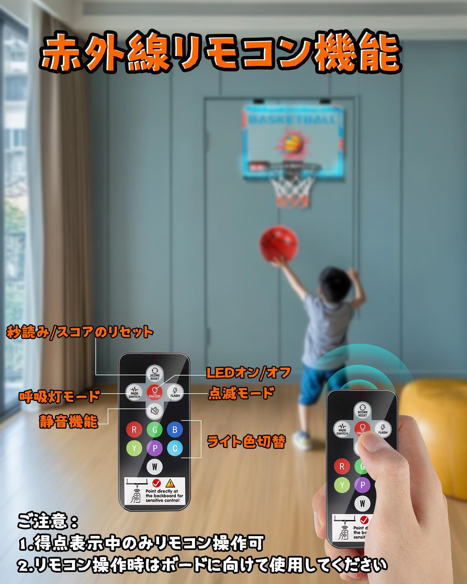 【リモコン機能】このバスケゴールは、驚くべき赤外線リモコン機能を搭載しており、1つのリモコンで、遠隔操作でオンオフ、照明色の変更、照明モードの切り替え、スコアのリセットなど、様々な操作が可能です!子供から大人まで、誰でも簡単に操作できる。(ご注意:セット内容にはリモコンが1つ含まれています)