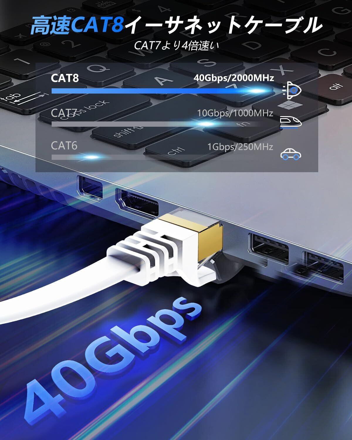 高速伝送: Cat8 Ethernetケーブルは、2000MHzおよび40Gbpsのデータ転送速度に対応し、サーバーアプリケーション、クラウドストレージ、5G高速通信、オンライン ビデオストリーミングおよびゲームなどの高速データ転送に対応します