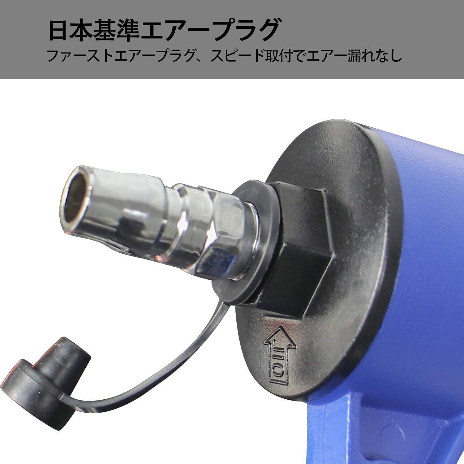 【仕様】動作圧力:本機の使用空気圧範囲は0.5~0.7MPa(約5~7kgf/cm2)、MAX0.8Mpaです。対応ネイルは市販F規格F10~F50。