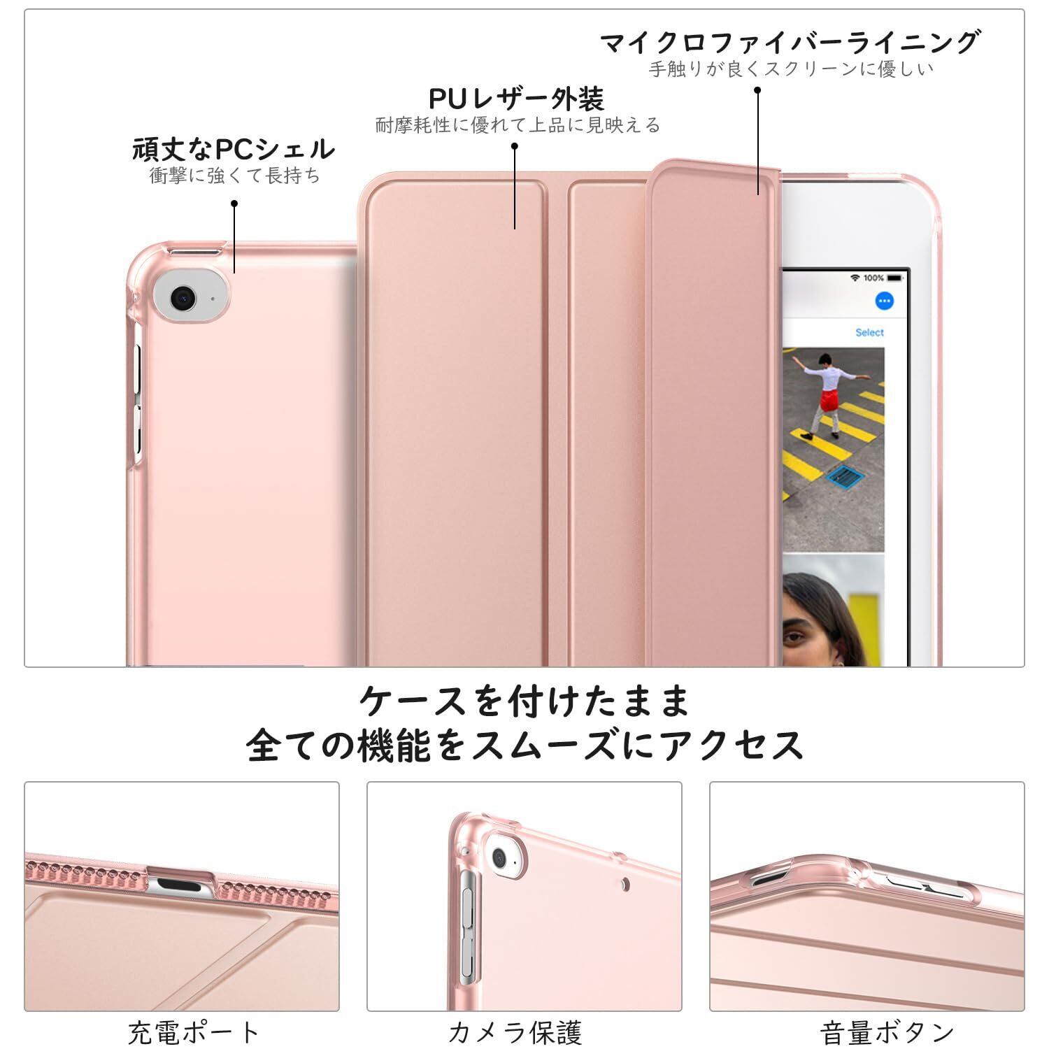 「上質な素材採用」蓋は手触りが良く高級感のあふれる耐久性に優れた高級PUレザーで、バックケースは頑丈で耐摩耗性の高いマット半透明のPC素材を採用しており、アップルロゴが透けて見えて綺麗に見映えてきます。裏地材質は液晶表面に優しいマイクロファイバーの仕上がりで、タブレットに最高の保護力を提供してくれます。