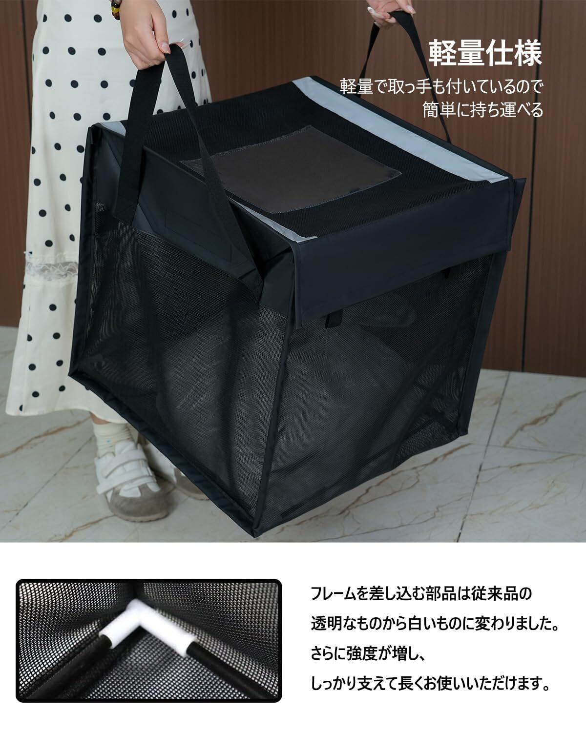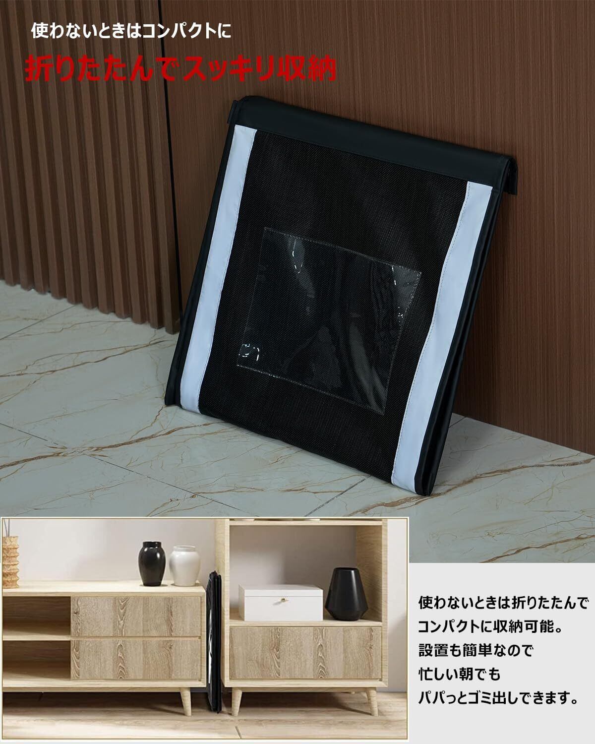 【軽量・折りたたみ可能・簡単設置】ゴミボックスはメッシュ素材なので超軽量!年寄りでも簡単に持ち運べます。必要な時にすぐ設置でき、使い終わったら折りたたんでコンパクトに収納可能。スリムで置き場所に困る心配なし!!折りたたみ時の厚み:約5cm。大型な固定されたものではなく、軽量なゴミネットボックスなのでバルコニーや庭、玄関先など設置場所を選びません。