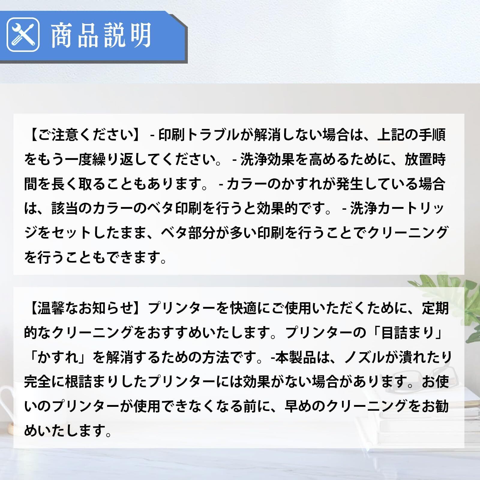 【温馨なお知らせ】プリンターを快適にご使用いただくために、定期的なクリーニングをおすすめいたします。プリンターの「目詰まり」「かすれ」を解消するための方法です。-本製品は、ノズルが潰れたり完全に根詰まりしたプリンターには効果がない場合があります。お使いのプリンターが使用できなくなる前に、早めのクリーニングをお勧めいたします。
